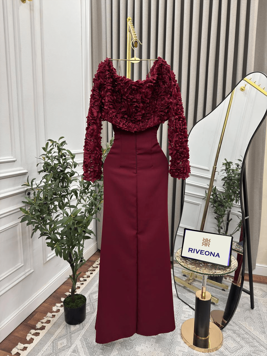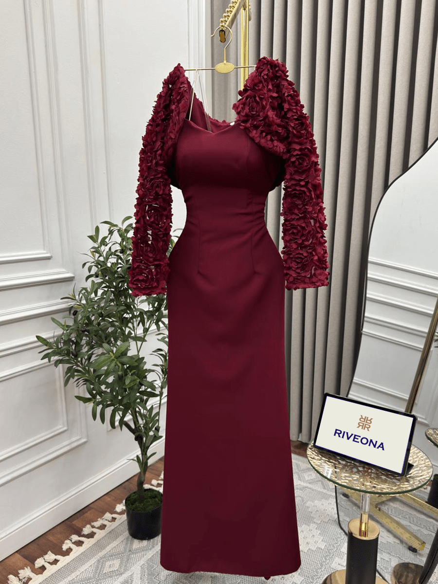 فستان ناعم بلون عنابي راق، يتميز بأكمام مطرزة بورود ثلاثية الأبعاد تضيف فخامة وأناقة. تصميم الخصر المحدد يبرز القوام بأسلوب أنثوي جذاب، مثالي للحفلات والخطوبات.
