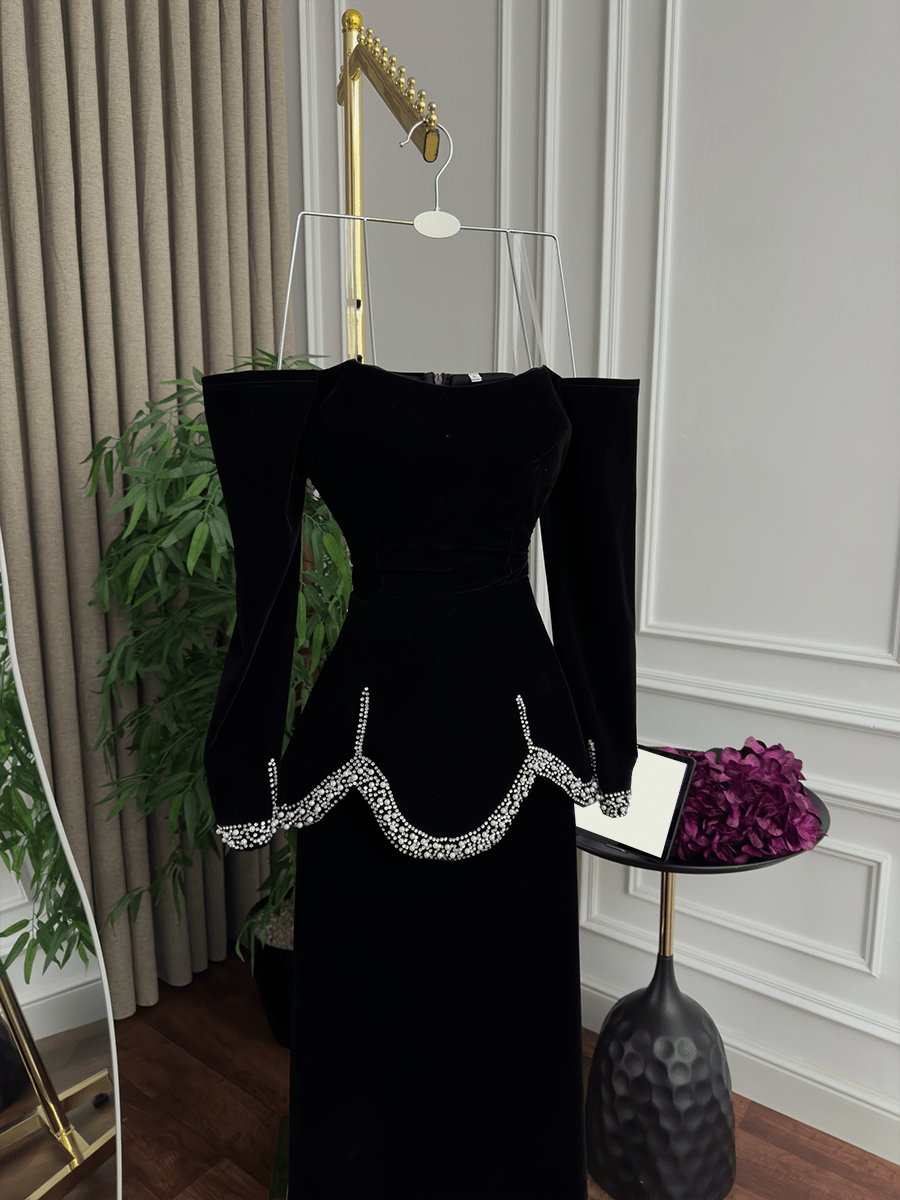 فستان سواريه مخمل أسود بتصميم أنيق وسلسلة خصر فخمة