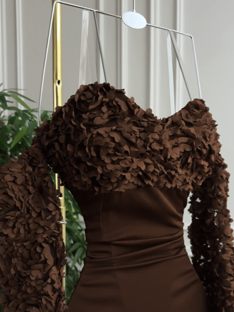 فستان مخمل بني بتفاصيل دانتيل وكاب فاخر
