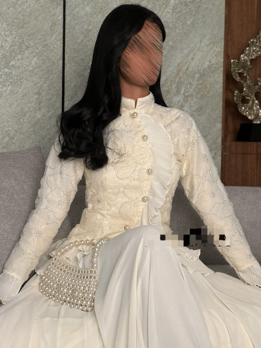 فستان أبيض بتصميم راقٍ وتطريز ناعم