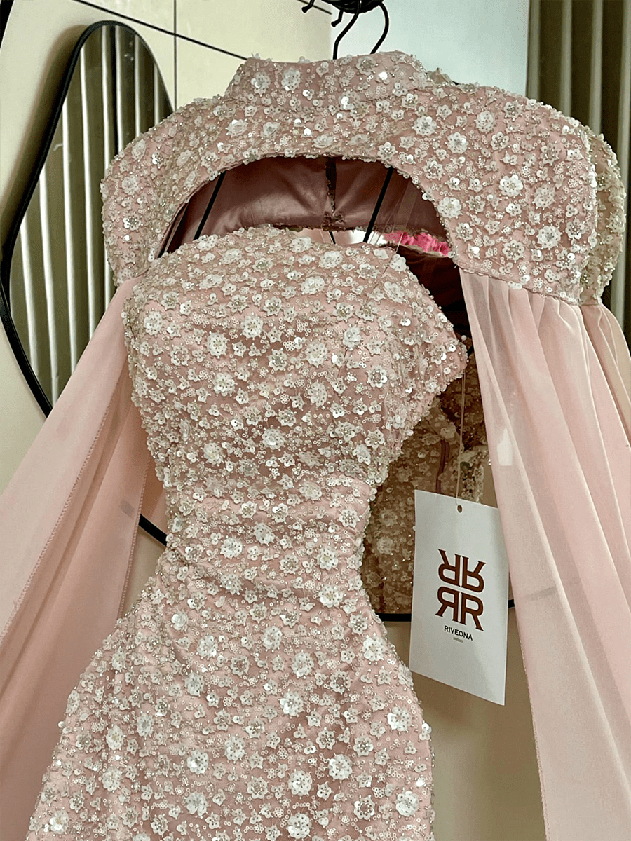 فستان سهرة وردي فاتح بتطريز كامل وذيل ناعم