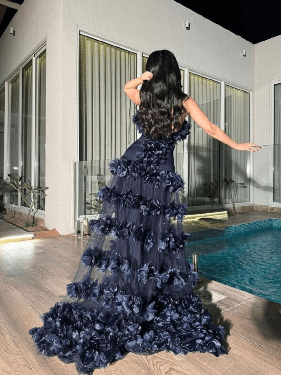 فستان سهرة كحلي منفوش بتطريزات ثلاثية الأبعاد