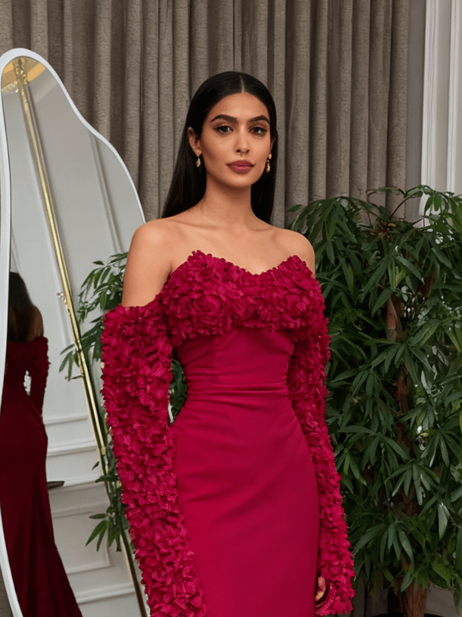 فستان أوف شولدر بتطريز ثلاثي الأبعاد باربي ذيل كلفه ورود