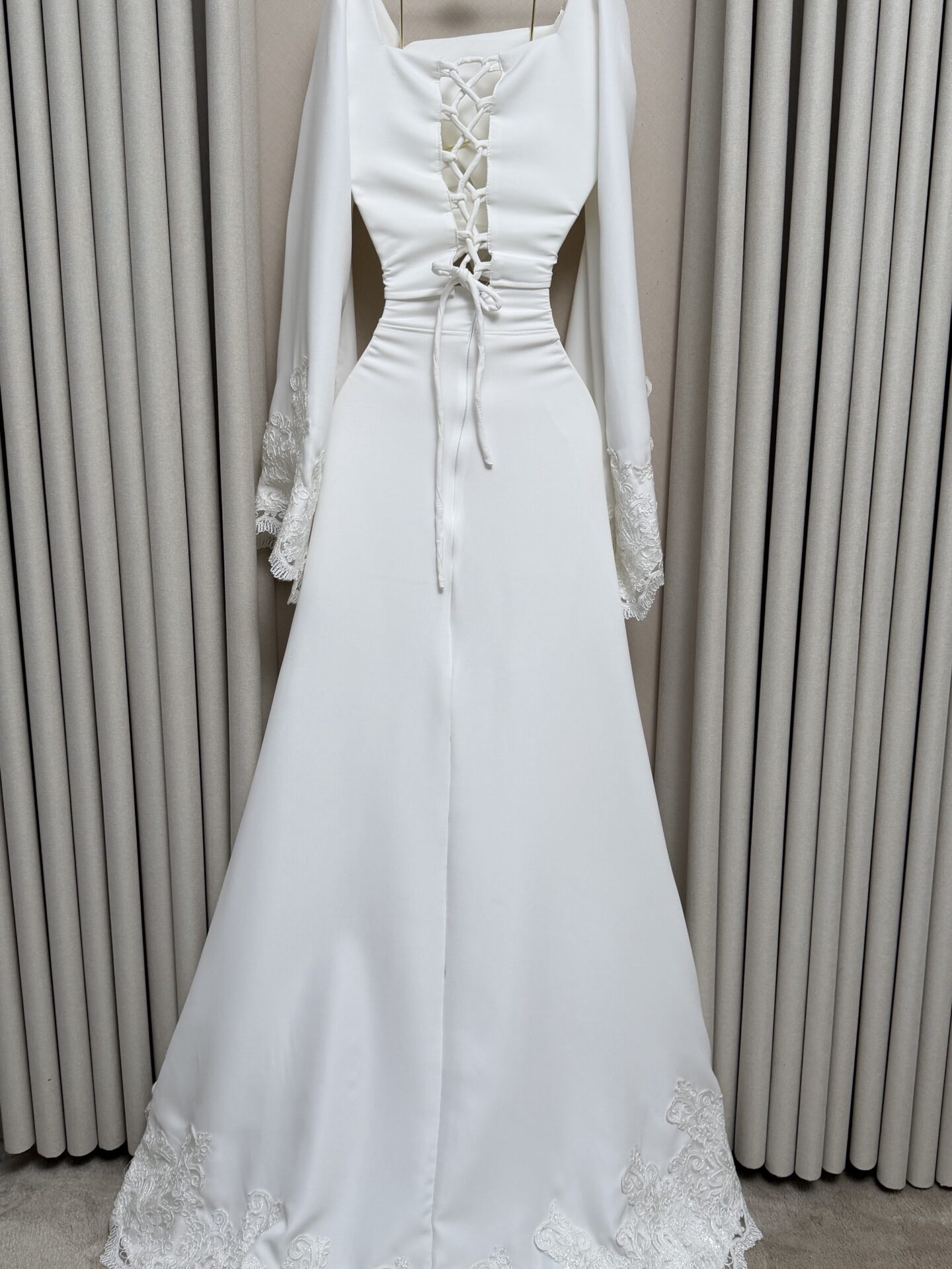 يتميز بقصة أنثوية تنسدل بانسيابية مع تطريز دانتيل في أسفل الفستان، ليمنح إطلالة كلاسيكية أنيقة مناسبة للمناسبات وحفلات الزفاف.