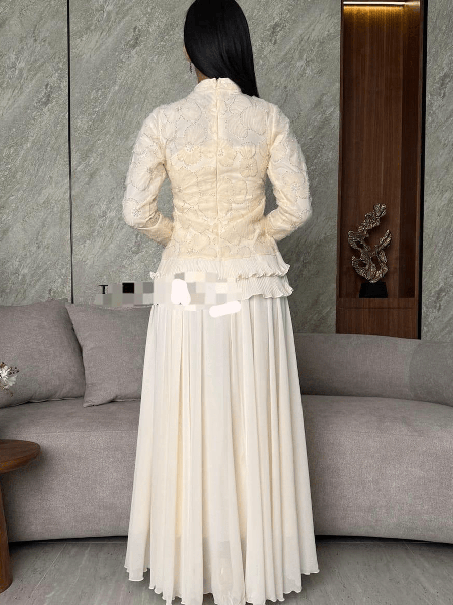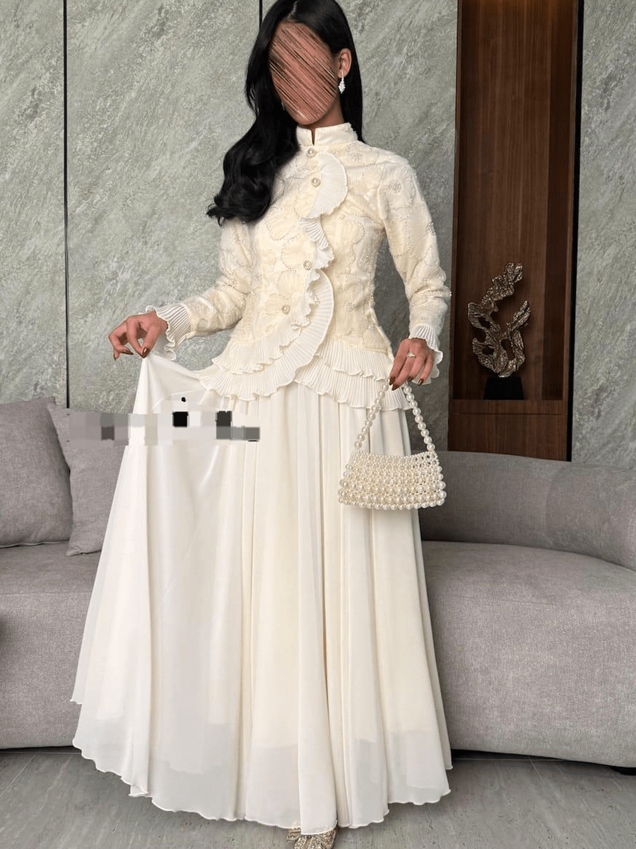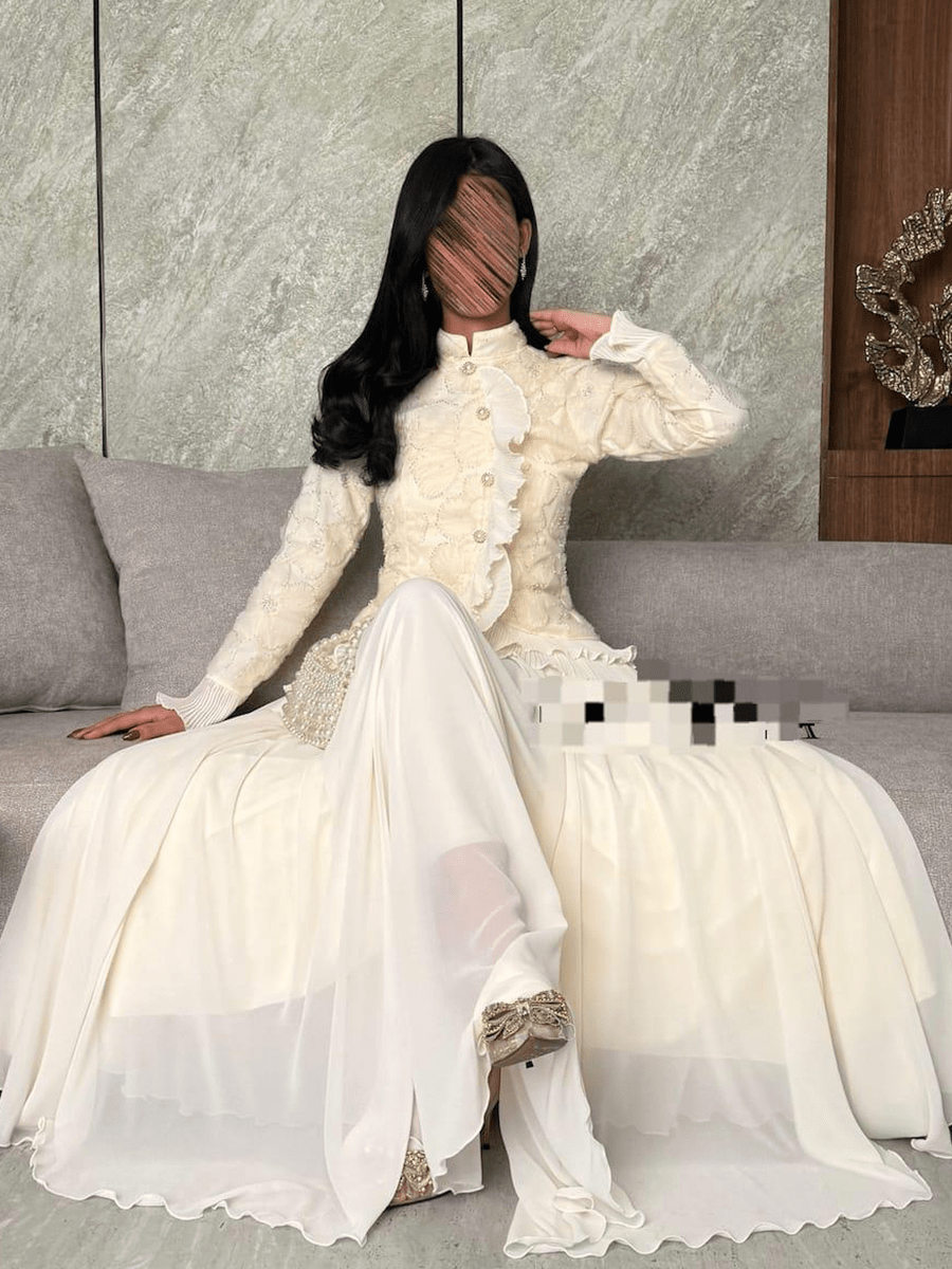 فستان خطوبة أبيض أنيق بتطريز يدوي دقيق وقصة ملكية فخمة. يجمع بين الأنوثة والرقي بتفاصيله الهادئة وأكمامه الطويلة التي تضيف لمسة من الجمال الكلاسيكي. مثالي لإطلالة راقية في حفلات الخطوبة والمناسبات الخاصة.