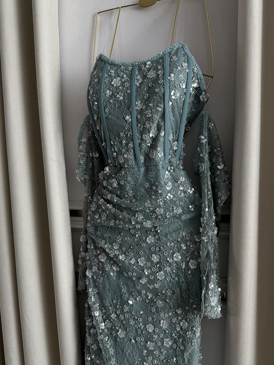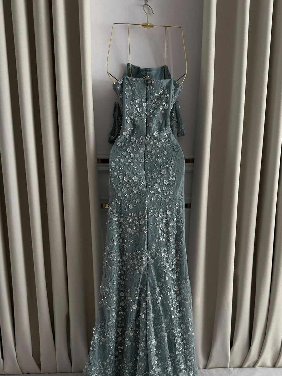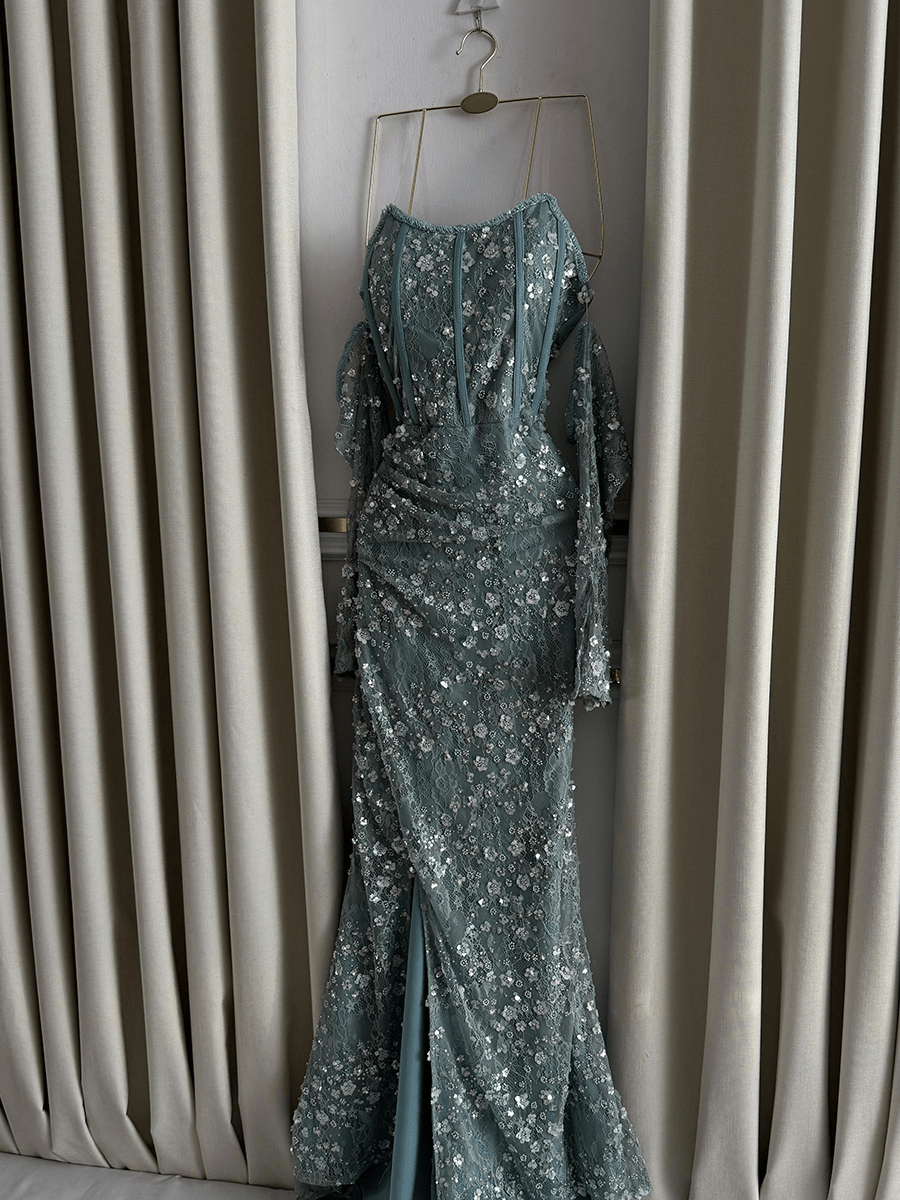 فستان فخم بتصميم ضيق من الشيفون المطرز يدويًا بالترتر والخرز اللامع، يمنحك إطلالة براقة مثالية لحفلات الخطوبة والمناسبات المميزة.
