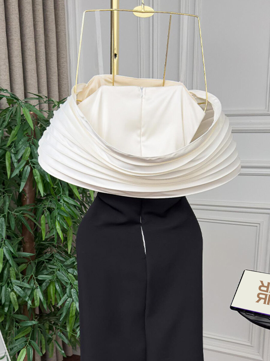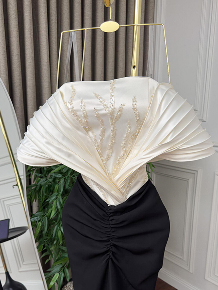 تميّزي بإطلالة جريئة وفاخرة مع فستان البيان الملكي. تصميم أسود أنيق مزود بكورسيه أبيض بارز يعكس القوة والفخامة، مع قصة Mermaid ضيقة تمنحك قوام ممشوق وحضور استثنائي في السهرات والمناسبات الفاخرة.