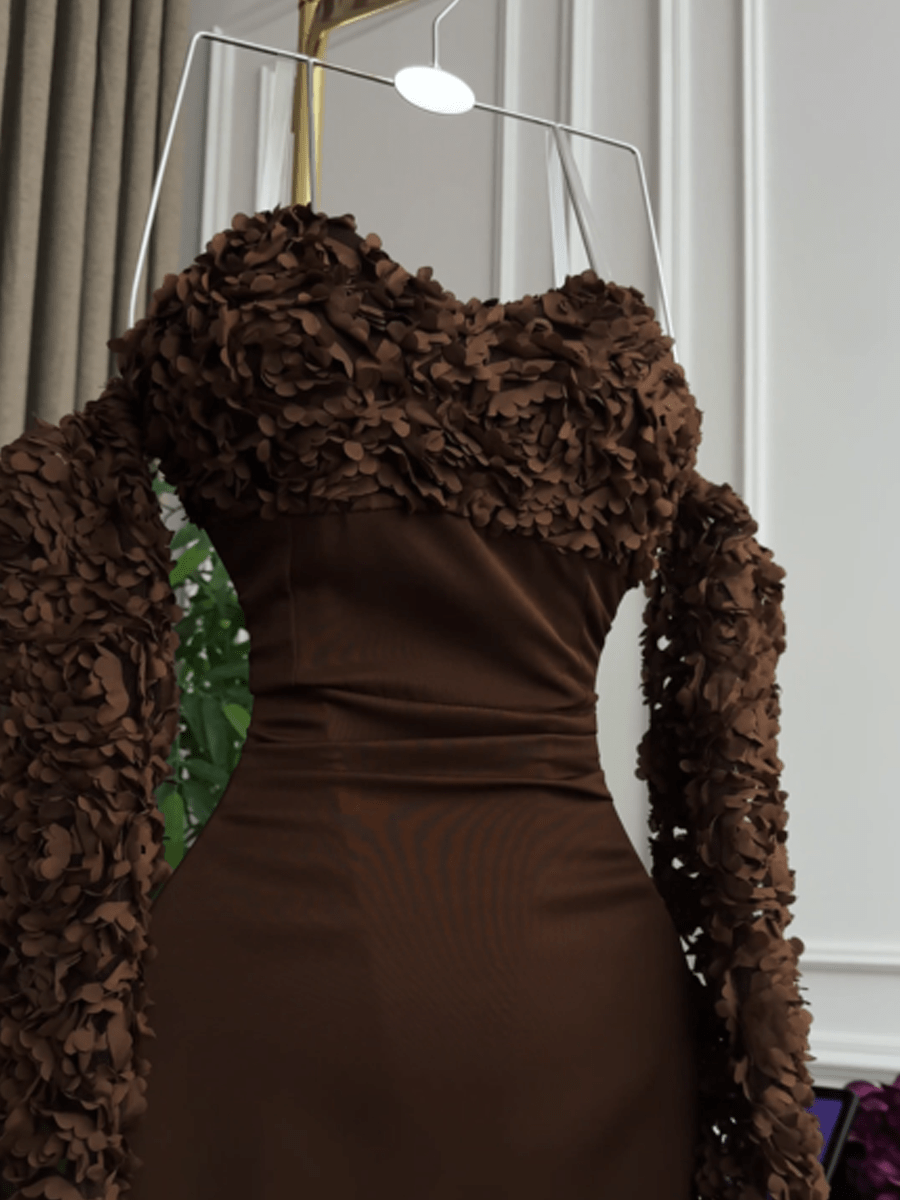 فستان سهره بتصميم أوف شولدر وتنورة خلفية من خامة مطرزة بالزهور ثلاثية الأبعاد. يجمع بين الجرأة والأناقة لتتألقي بإطلالة أنثوية لا تُنسى في المناسبات الخاصة.