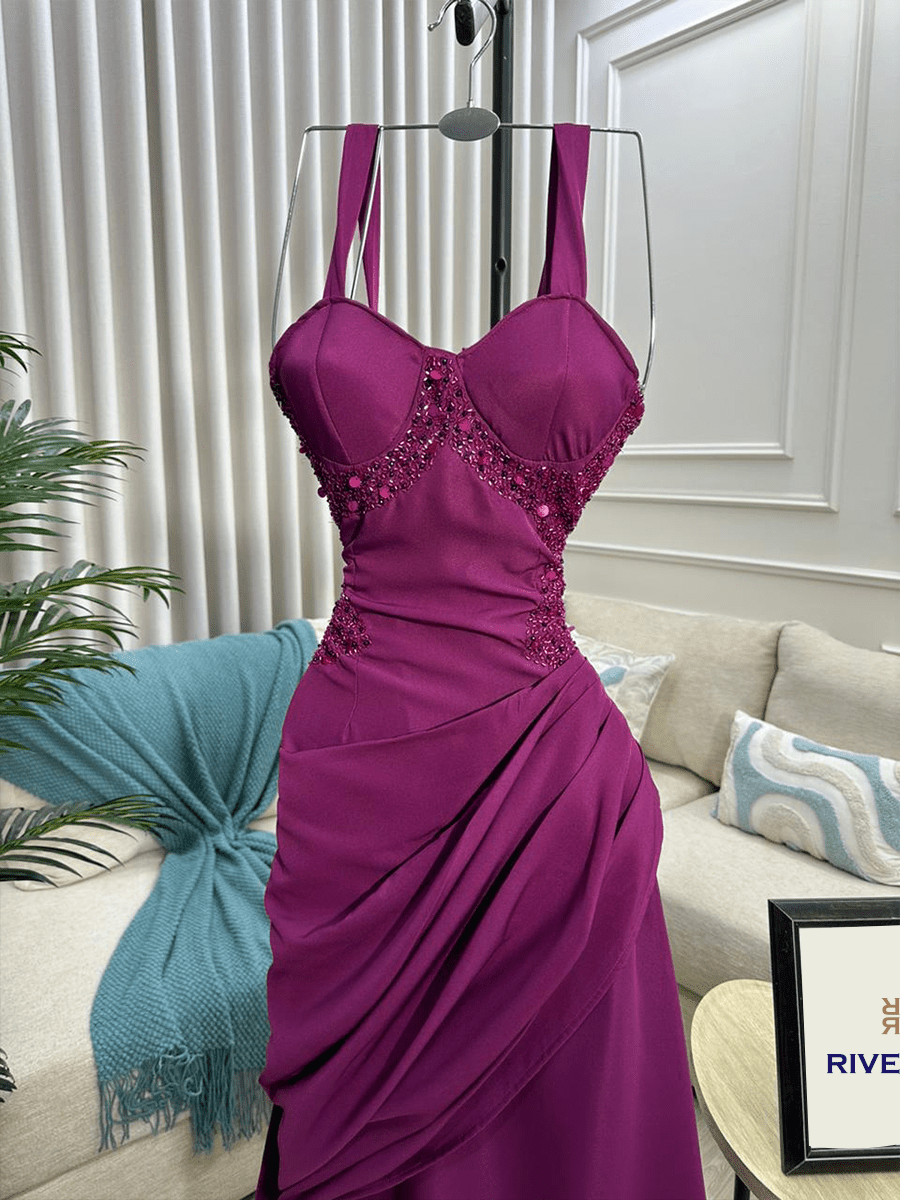 فستان خطوبة فاخر من الساتان المطفي بلون بنفسجي ساحر، بتصميم مكشوف الأكتاف وقصة جانبية بطيات ناعمة تمنحك مظهرًا راقيًا وأنوثة لافتة في أهم مناسباتك.