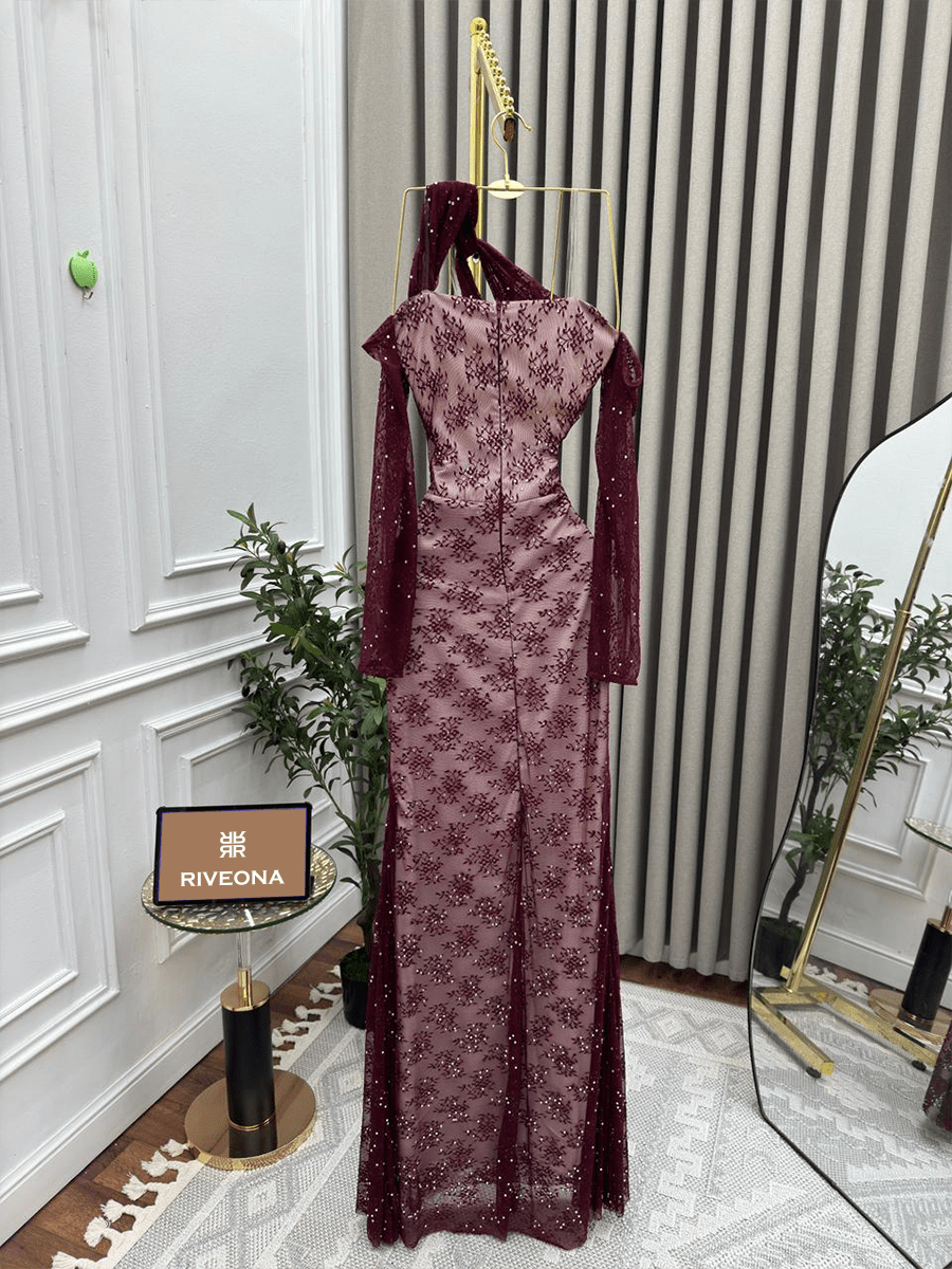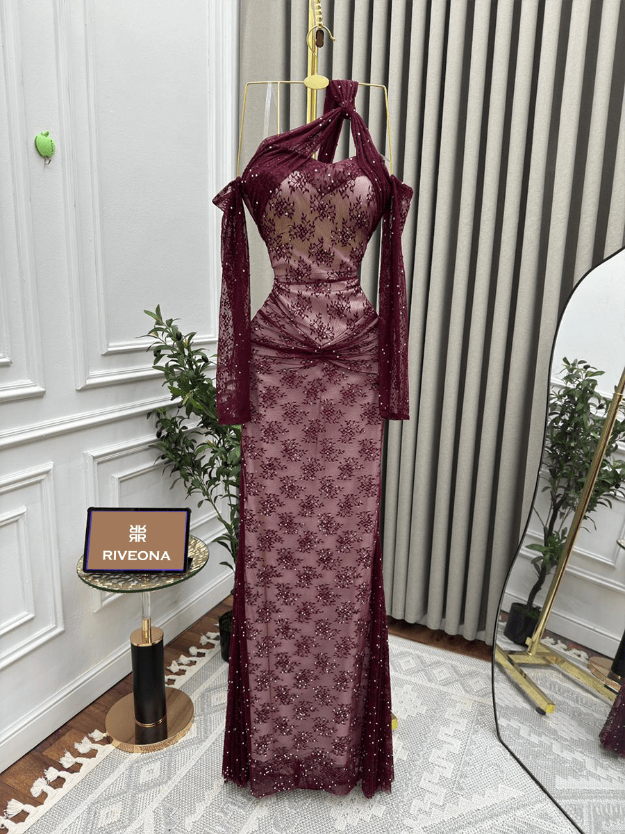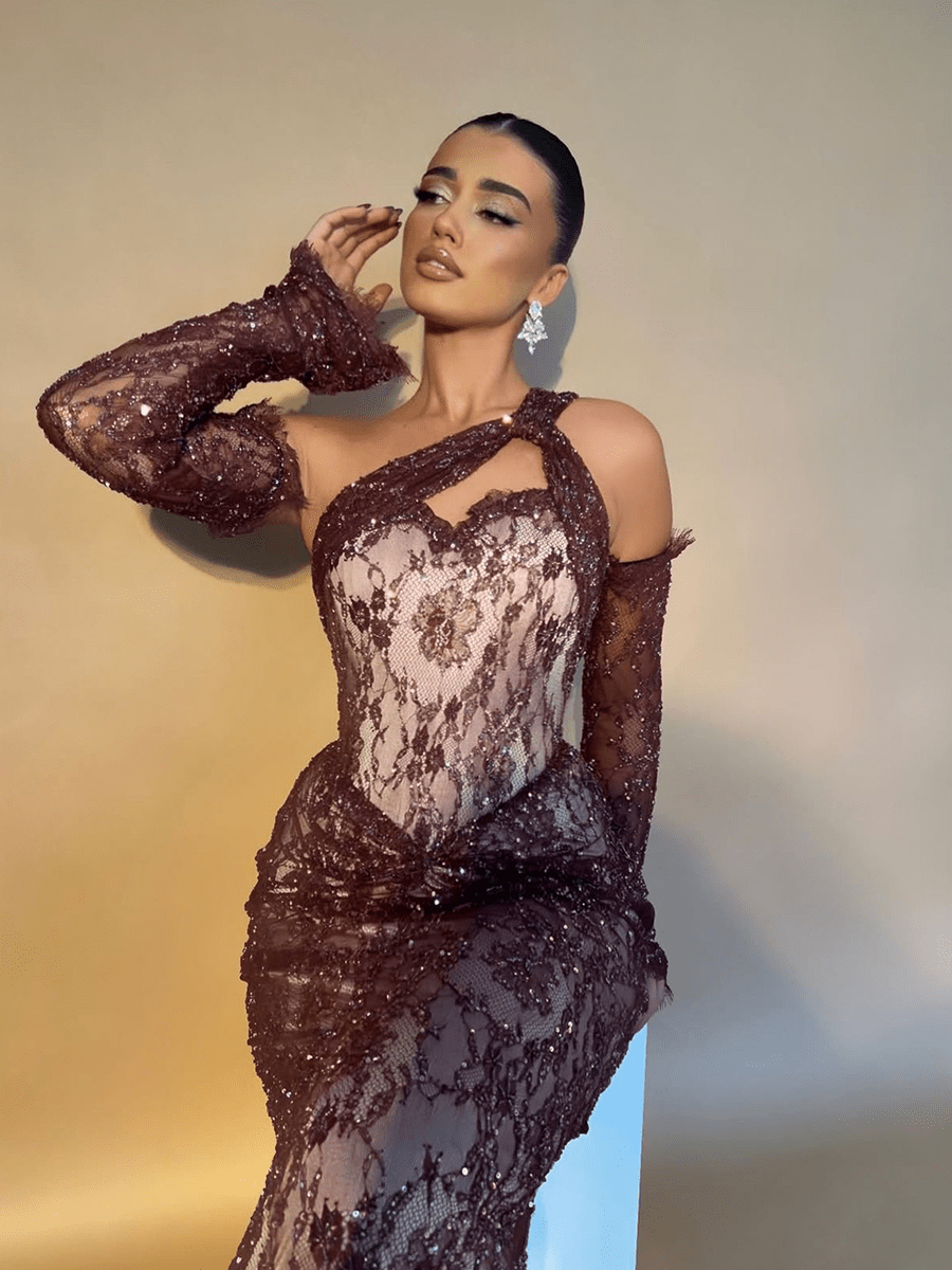 فستان أنيق من الدانتيل الفاخر بتفاصيل لامعة وقصة غير متناظرة على الكتف تضيف لمسة عصرية. التصميم الضيق يبرز جمال القوام ويمنحك حضورًا راقيًا وجذابًا.