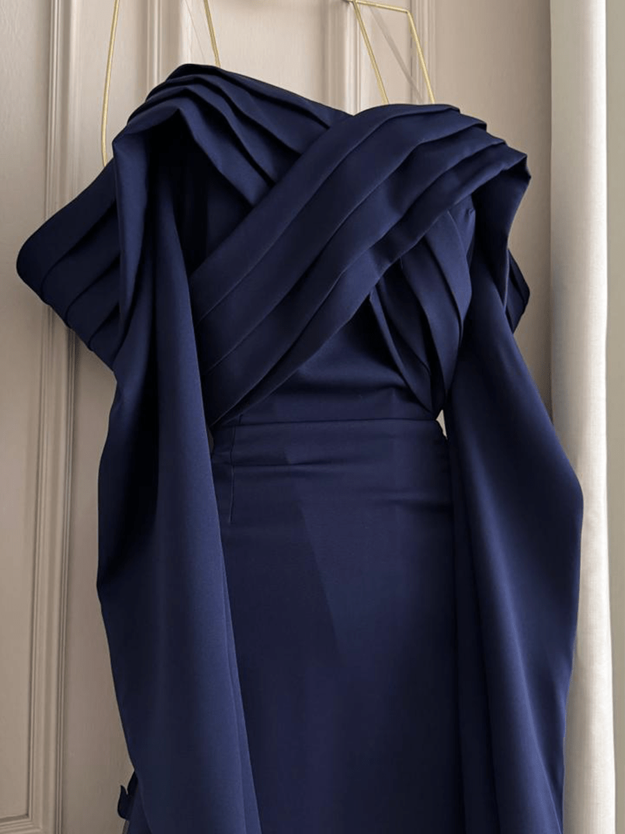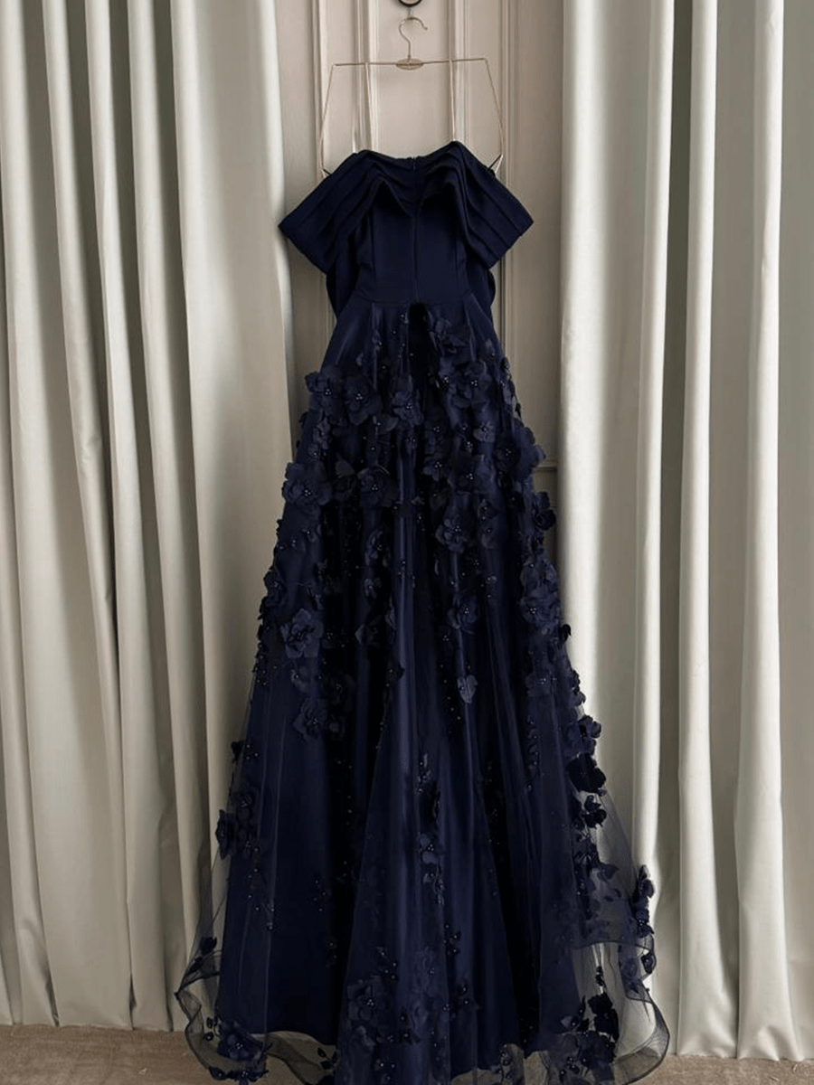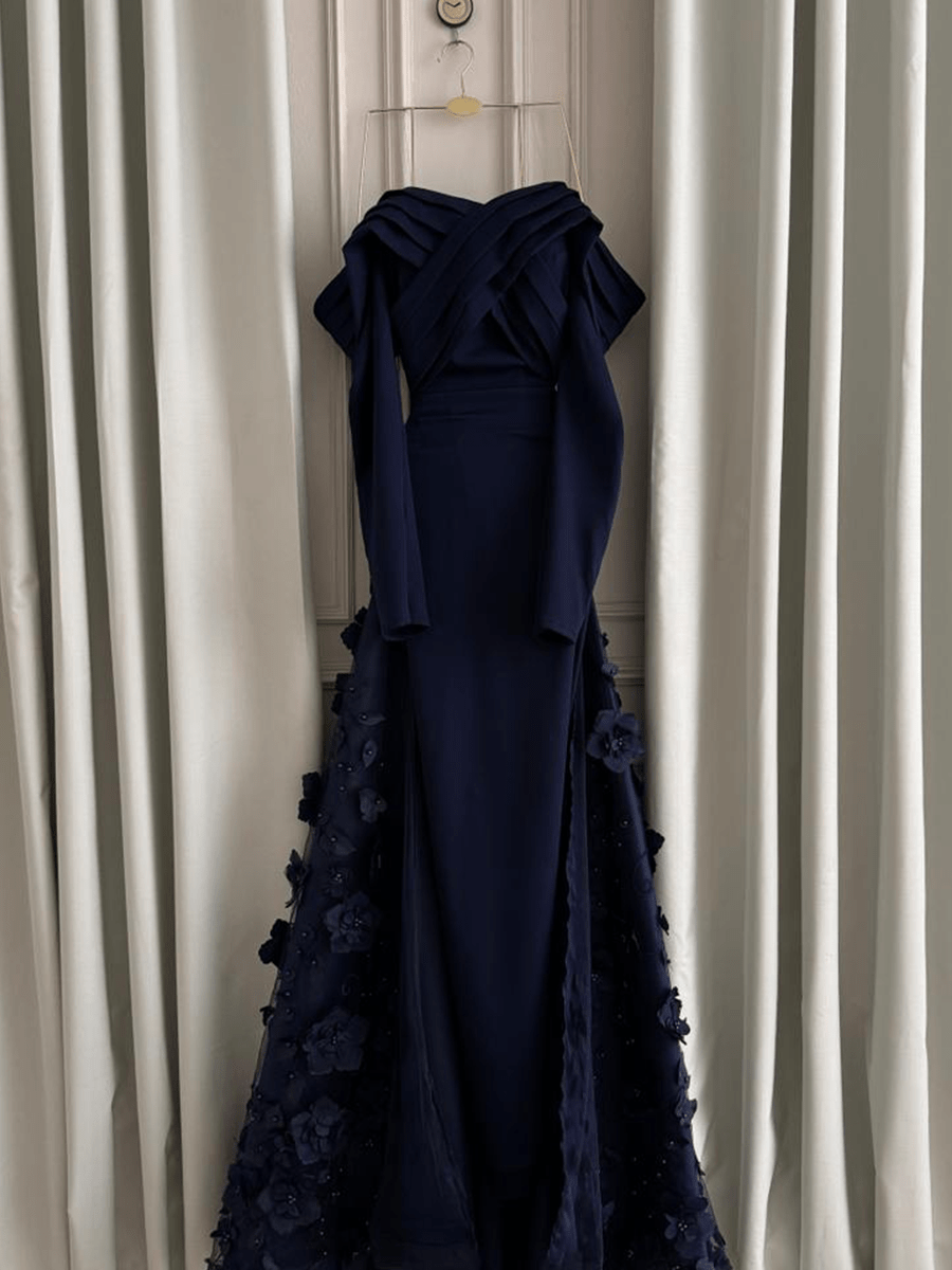 فستان أزرق كحلي فخم بتصميم أوف شولدر يجمع بين الرقة والفخامة. مصنوع من قماش الساتان الفاخر وتنورة بطبقات من الورود البارزة تمنحك إطلالة أميرية في المناسبات الكبرى.