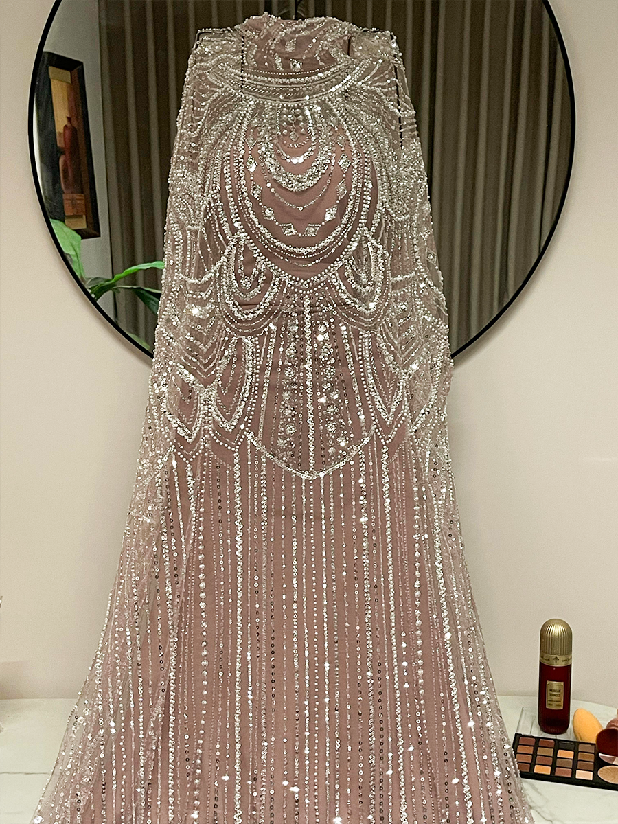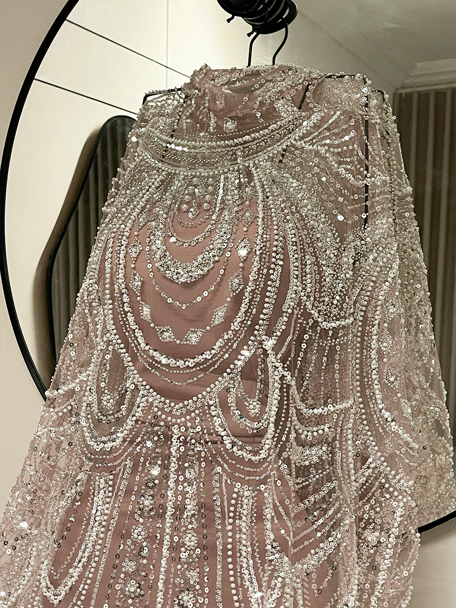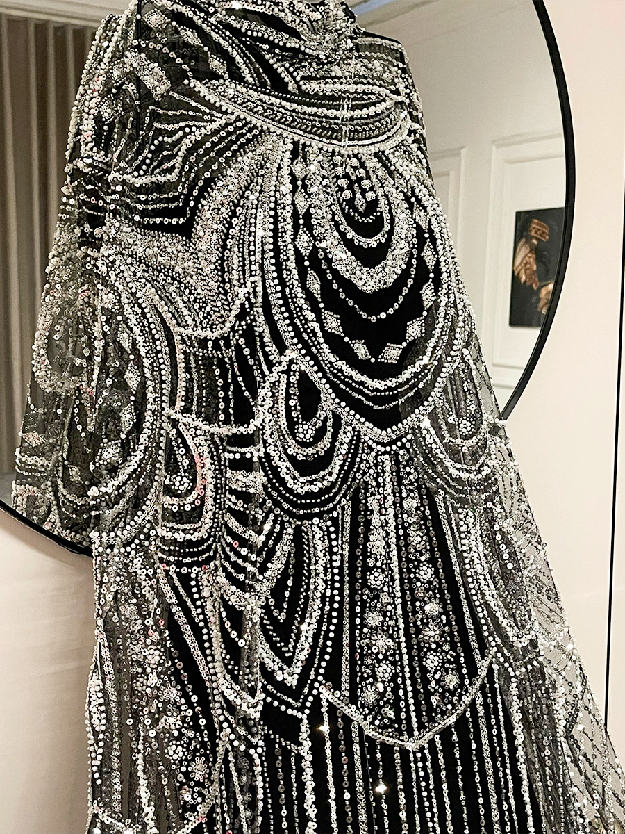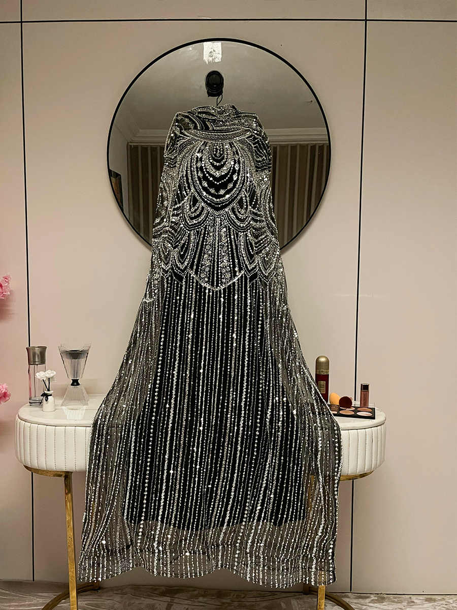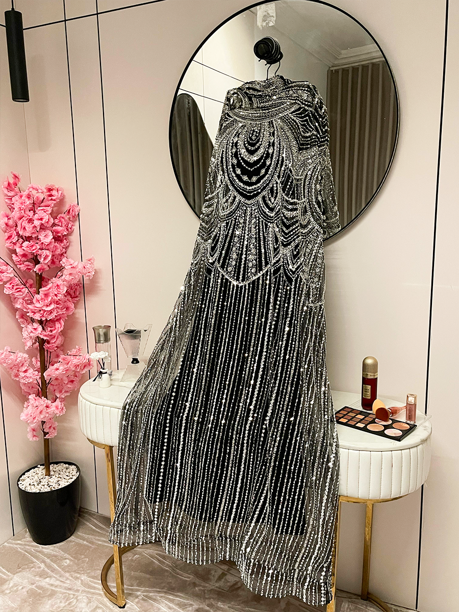 فستان سهرة أسود فخم مطرز بالكامل بخرز ولمعات متدرجة تمنحه حضوراً لافتاً في أي مناسبة. يتميز بقصة انسيابية تضفي طول ورشاقة على القوام، مع تفاصيل هندسية تضيف لمسة ملكية متقنة. خيار مثالي للسهرات الفاخرة والإطلالات الراقية.