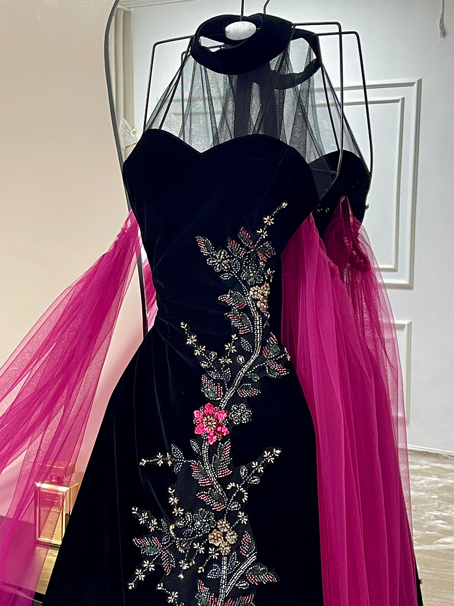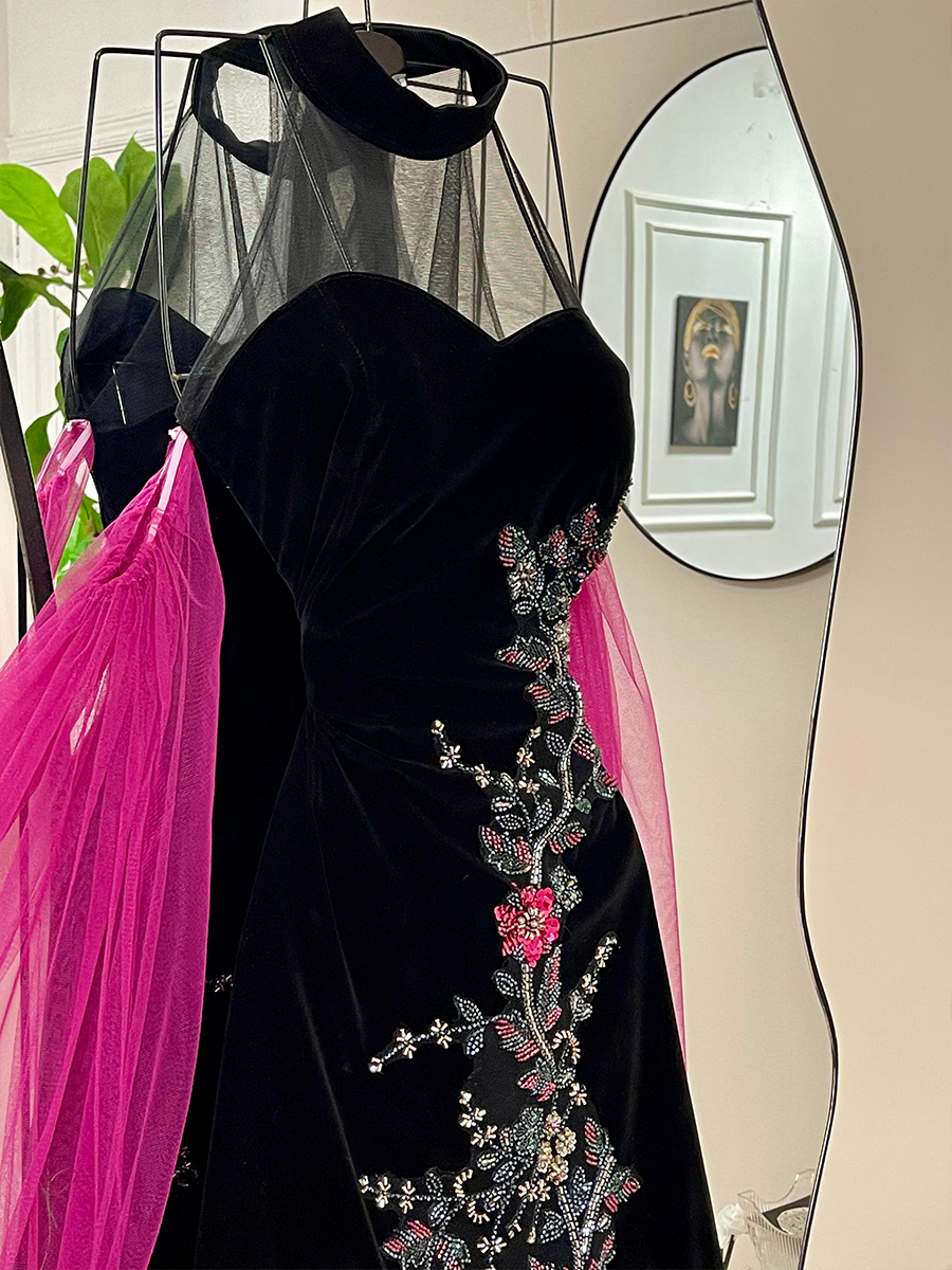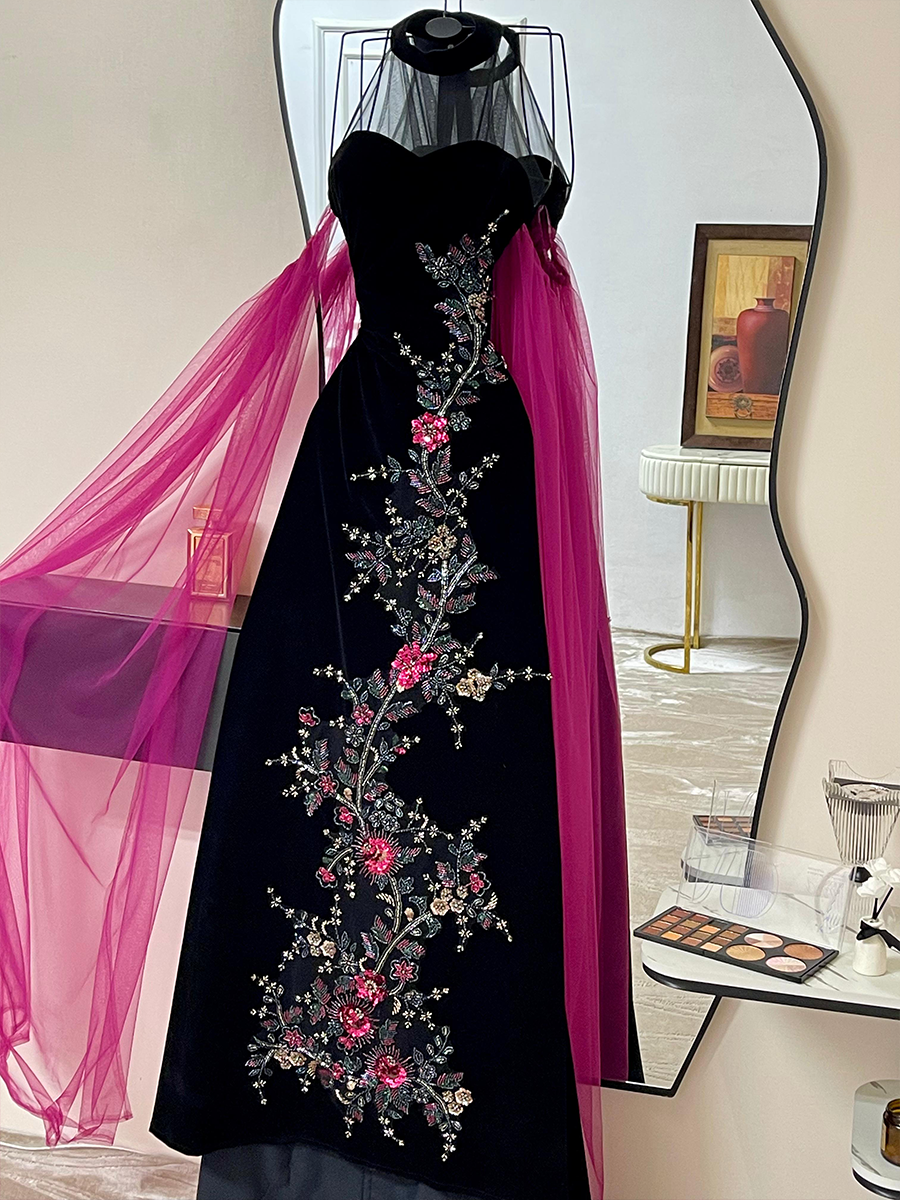 فستان راقٍ يجمع بين التطريز الفخم على القماش الأسود وبين الطرحة الفوشيا الطويلة التي تمنح حضورًا ملفتًا وجريئًا. قصة ضيقة تُبرز جمال القوام مع تطريزات وردية أنيقة تضيف بعدًا أنثويًا راقيًا. مثالي للسهرة والمناسبات الفاخرة.