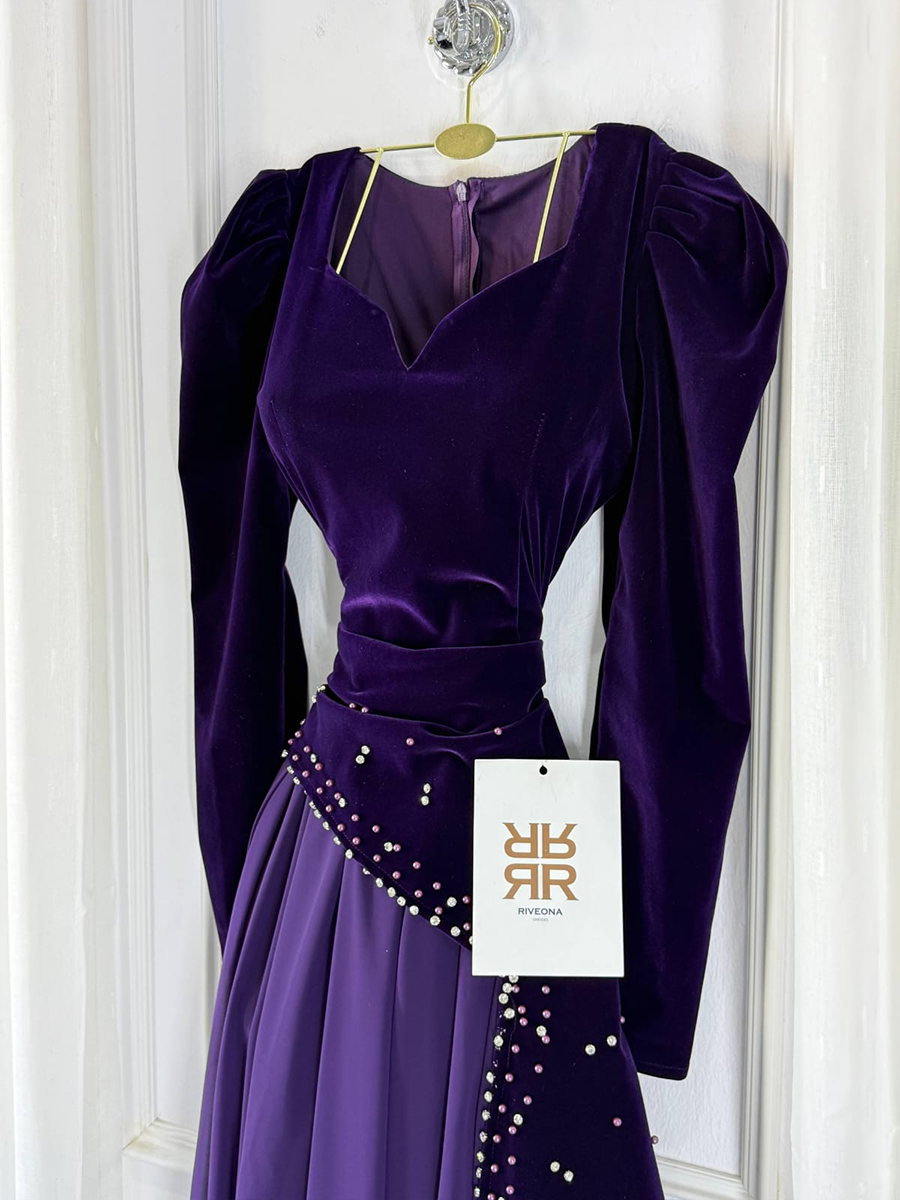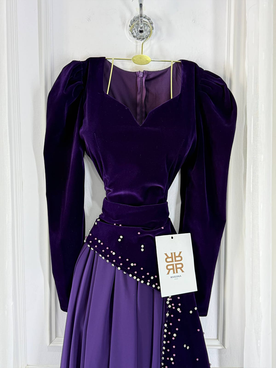 فستان راقٍ مصنوع من قماش مخملي ناعم بلون بنفسجي عميق، يتميز بتفاصيل كريستالية دقيقة على الخصر تضيف لمسة بريق أنثوية. الأكمام الطويلة والقصة الواسعة من الأسفل تمنح إطلالة أنيقة ومريحة تناسب السهرات الراقية والمناسبات الخاصة.