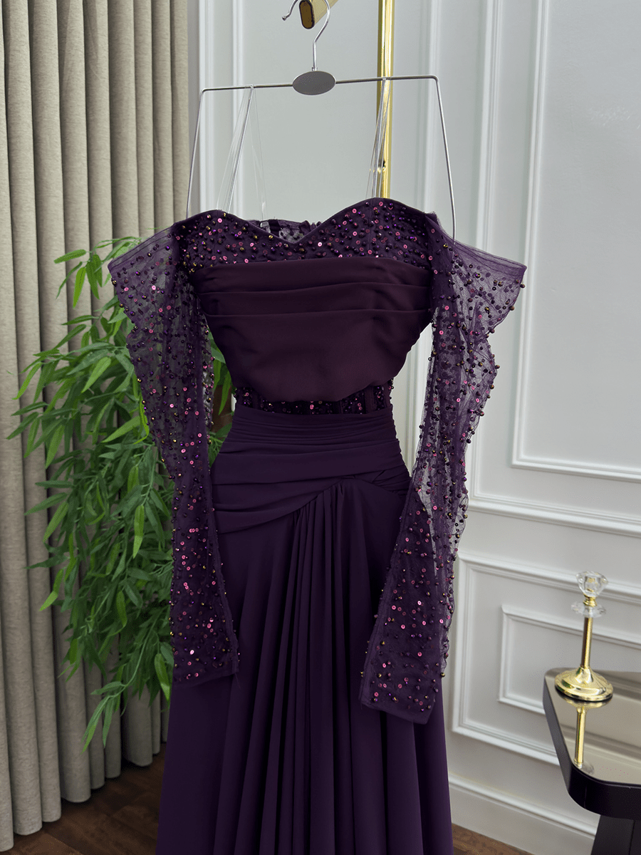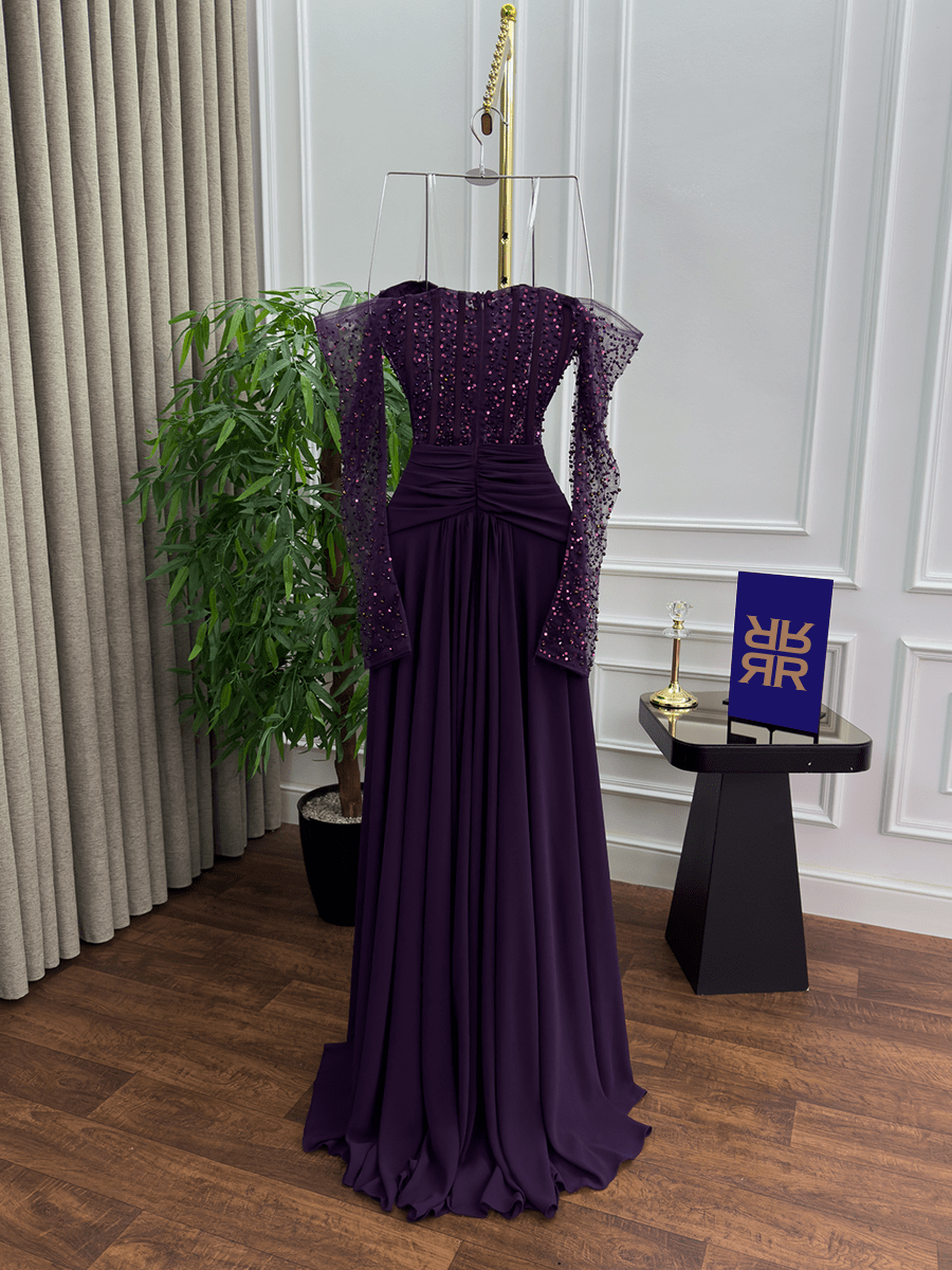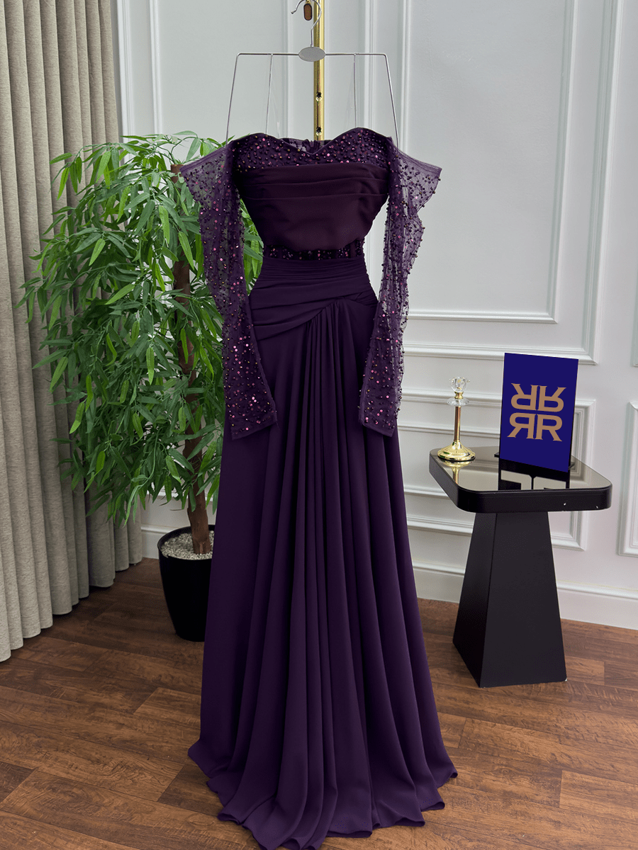 فستان فخم بلون بنفسجي عميق بتصميم ملكي يعكس الأناقة والثقة. مصنوع من قماش فاخر مع تفاصيل ناعمة على الصدر وانسيابية رائعة في القماش السفلي. خيار مثالي لإطلالة راقية في المناسبات الفاخرة أو حفلات الزفاف المسائية.