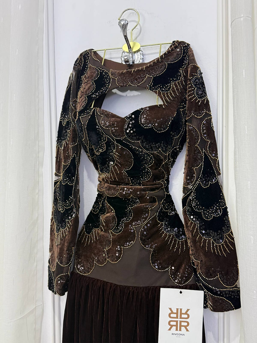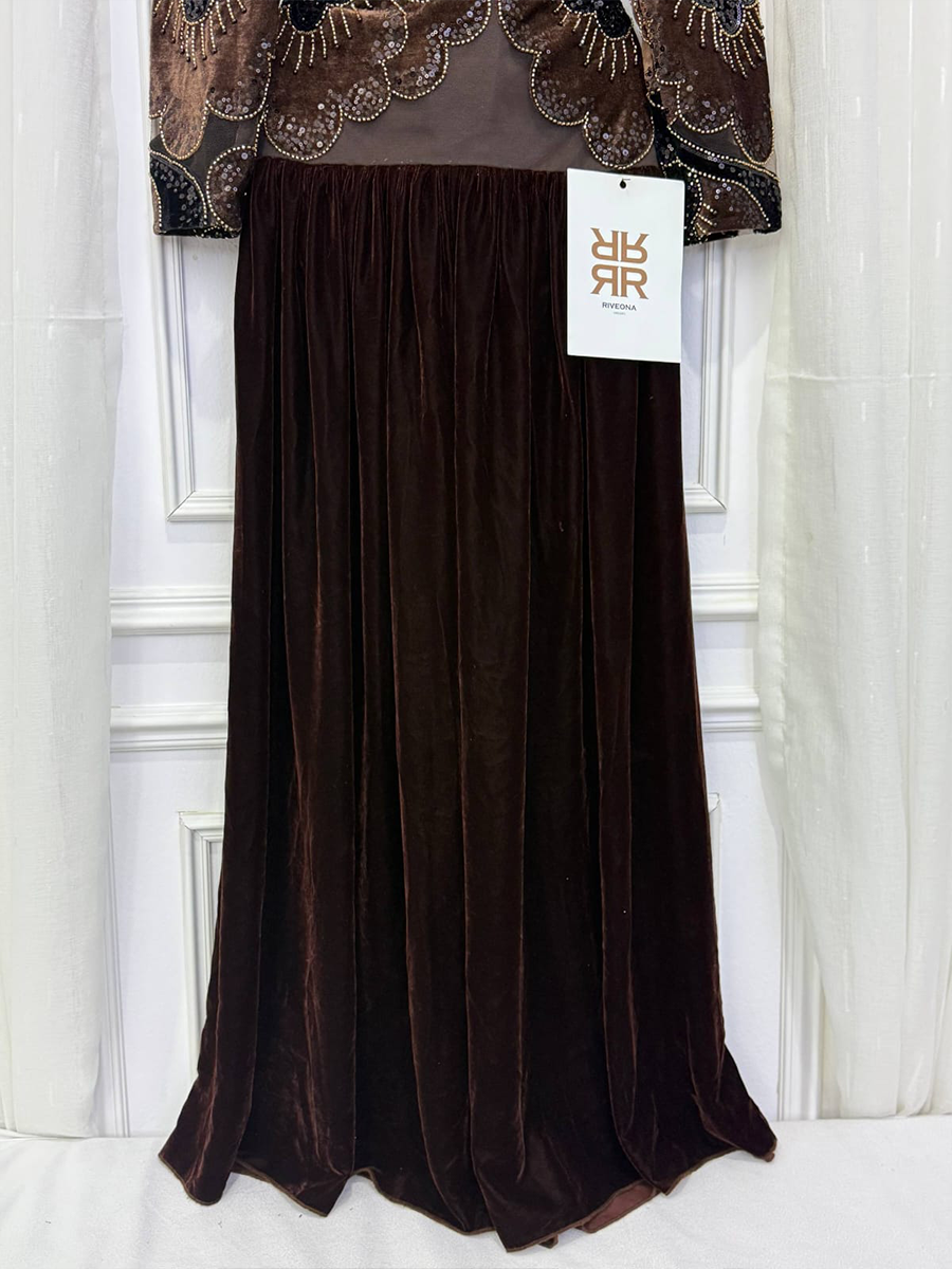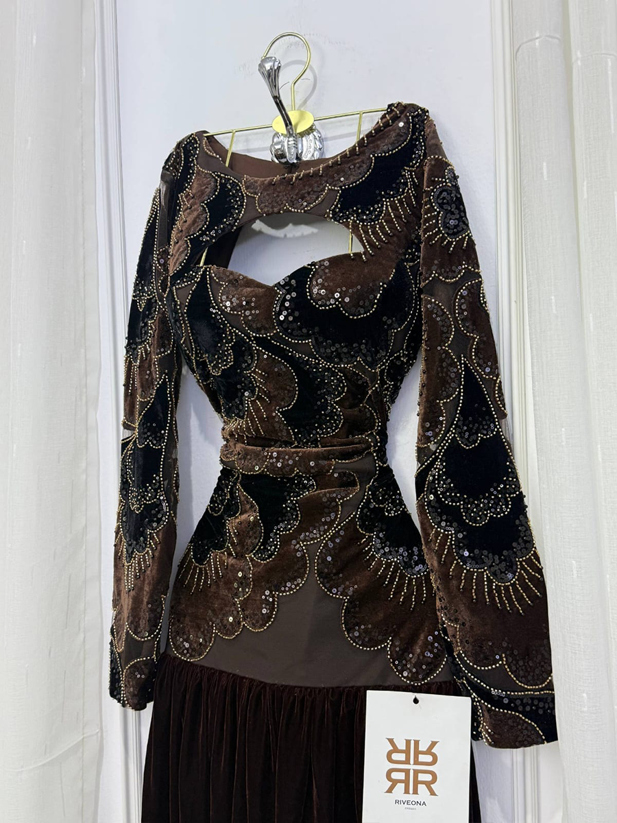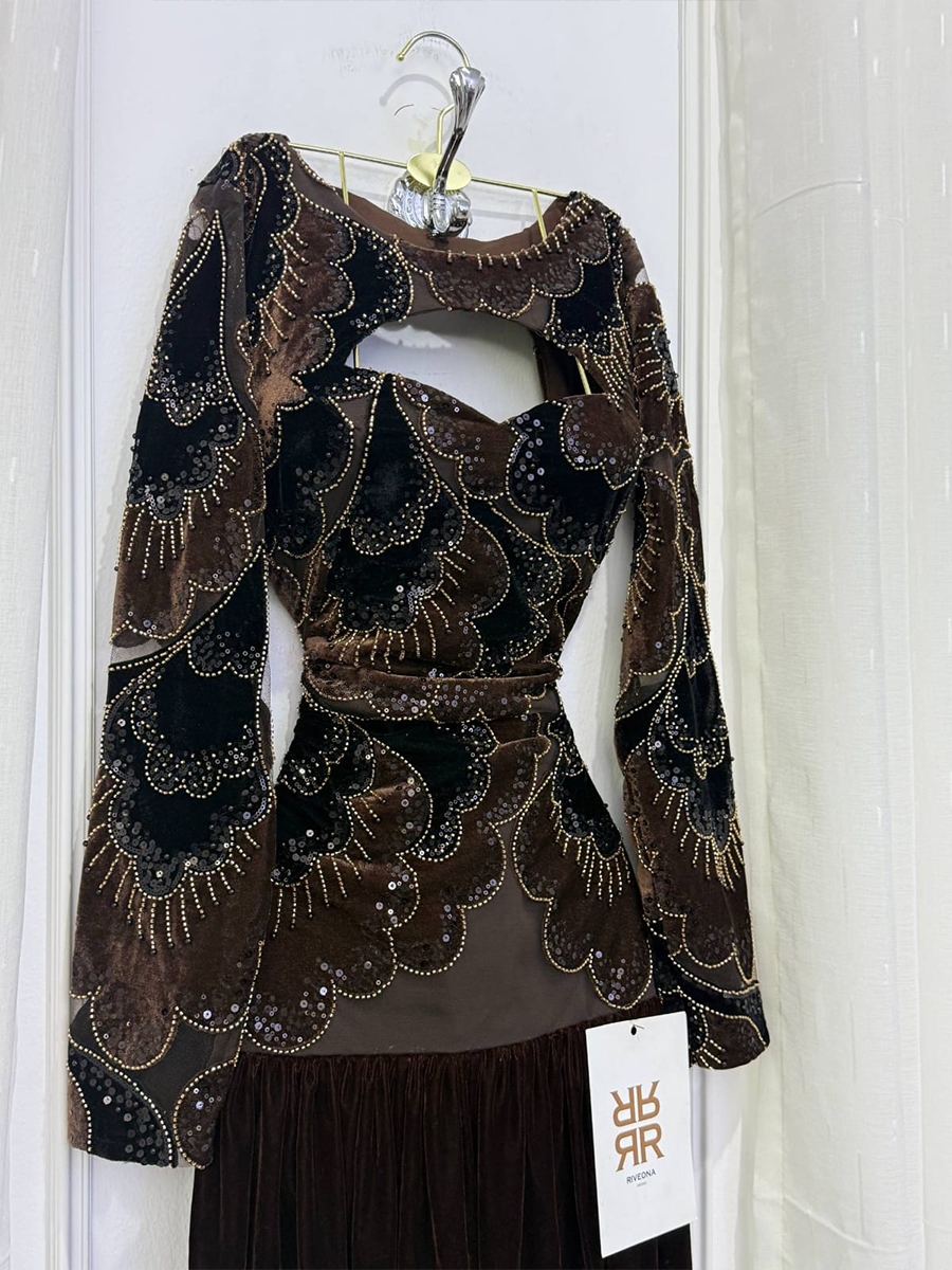 فستان سهرة بلون بني دافئ مطرز بتفاصيل فاخرة تبرز فخامته. يتميز بأكمام طويلة مزينة وتطريزات ناعمة تضيف توازناً بين الأناقة والاحتشام، ليكون خياراً مثالياً لسهرات الشتاء والمناسبات الرسمية.