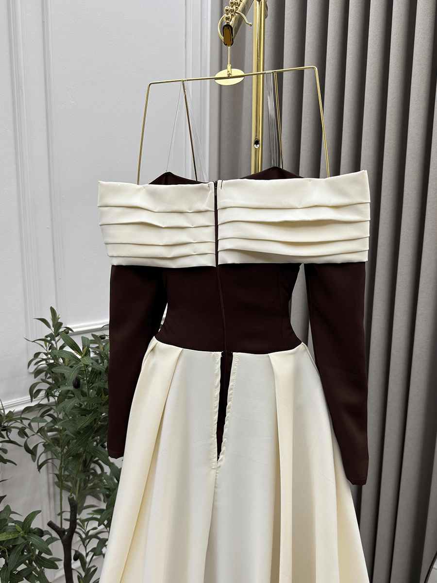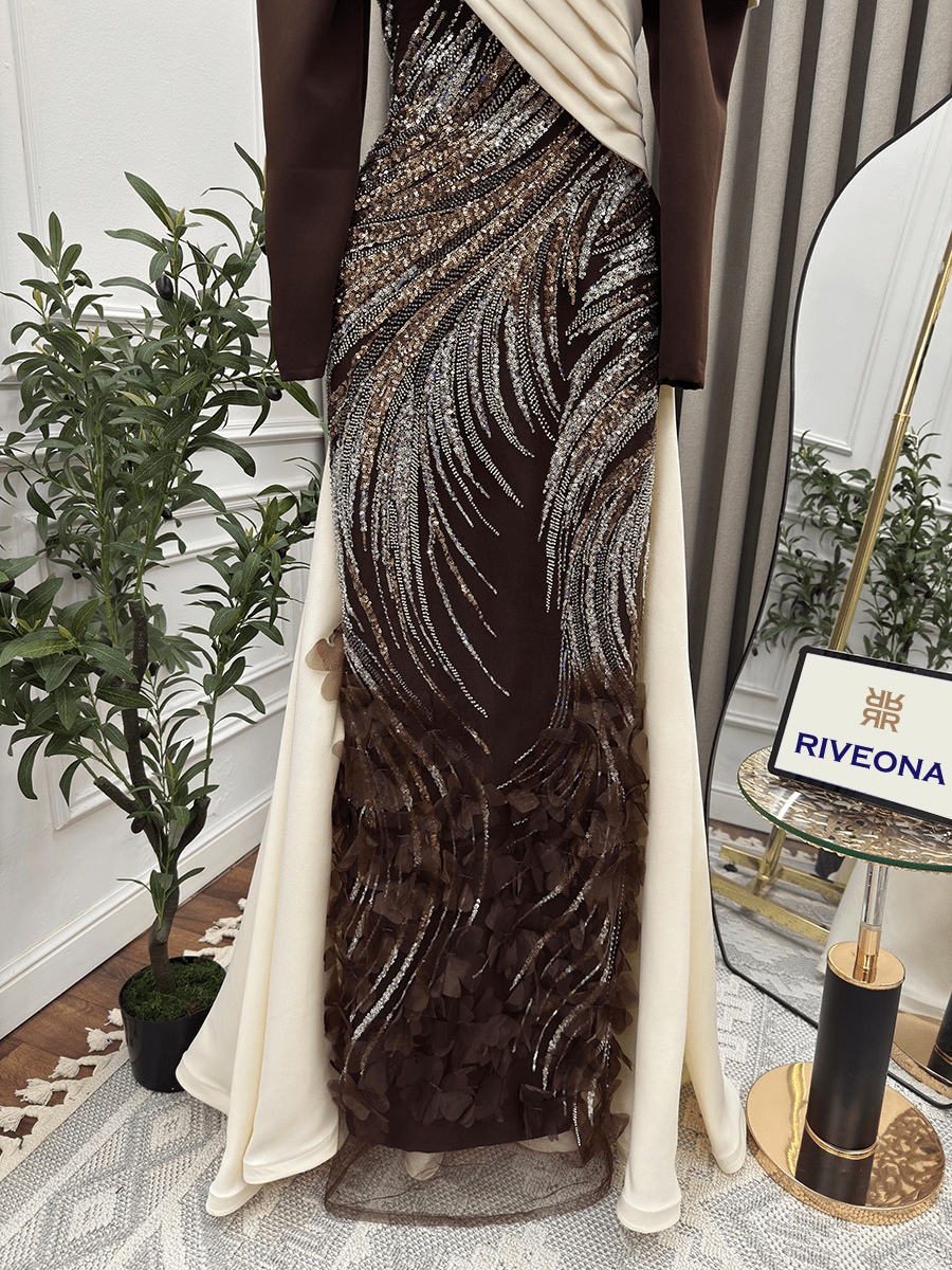 فستان فخم يجمع بين الحرير والدانتيل المطرز، باللون البني الداكن مع تفاصيل بيج أنيقة على الأكتاف، وتصميم ذي كاب انسيابي يمنح حضورًا راقيًا وأنيقًا.