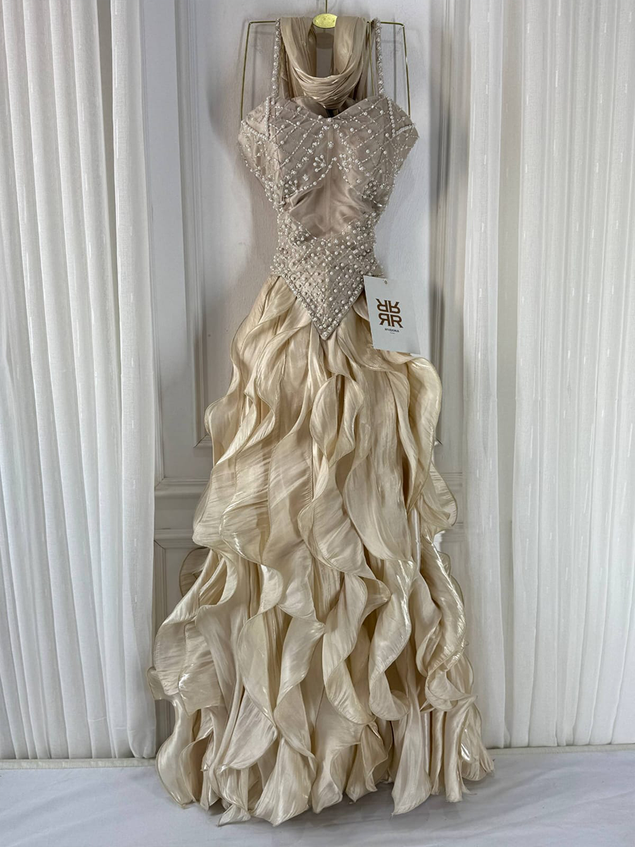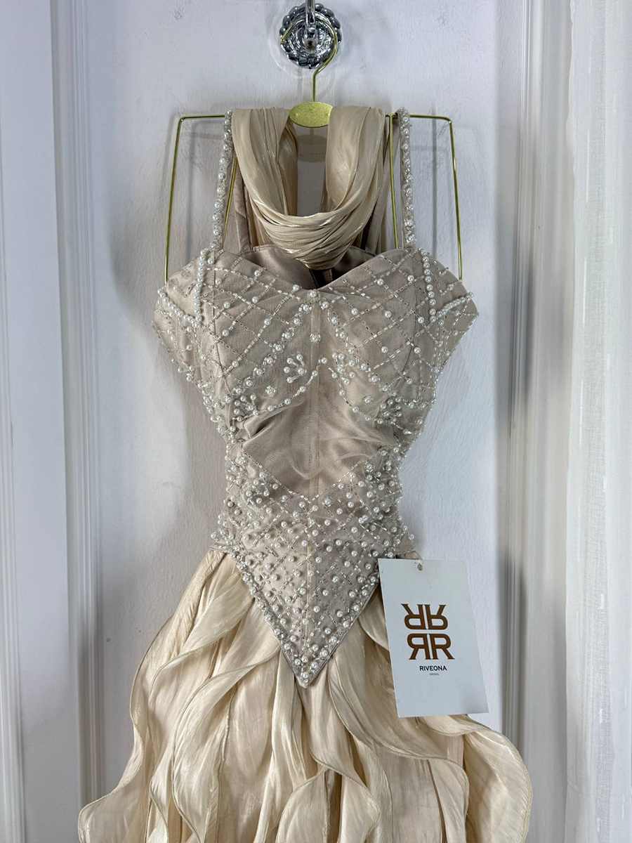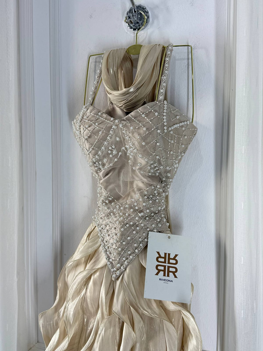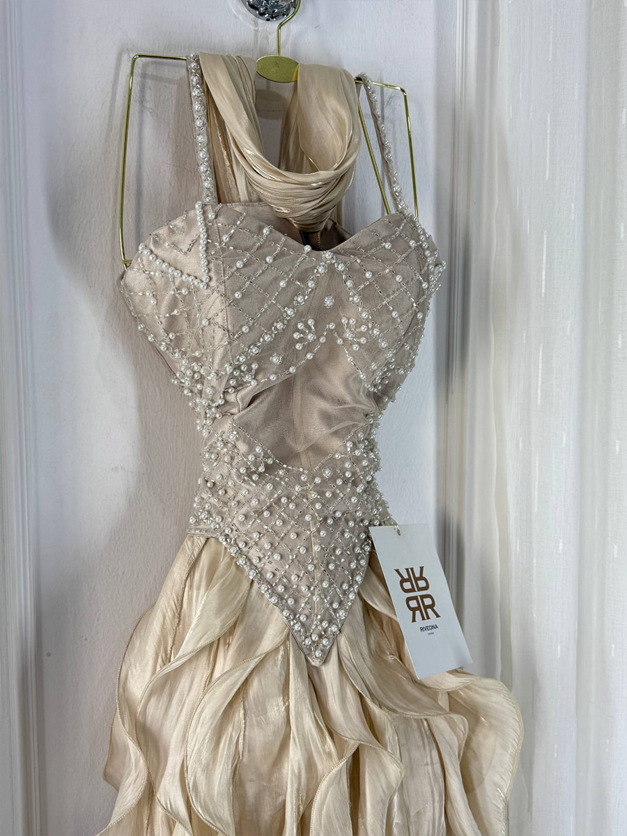 فستان أنثوي فاخر بلون بيج راقٍ، يتميز بتطريزات لامعة على الصدر تضيف لمسة فخامة ناعمة. تنورة الكشكش المتدرجة تمنح التصميم حركة وحيوية مع إبراز جمال القوام، ليكون خيارًا مثاليًا لحفلات الخطوبة والسهرات المميزة.