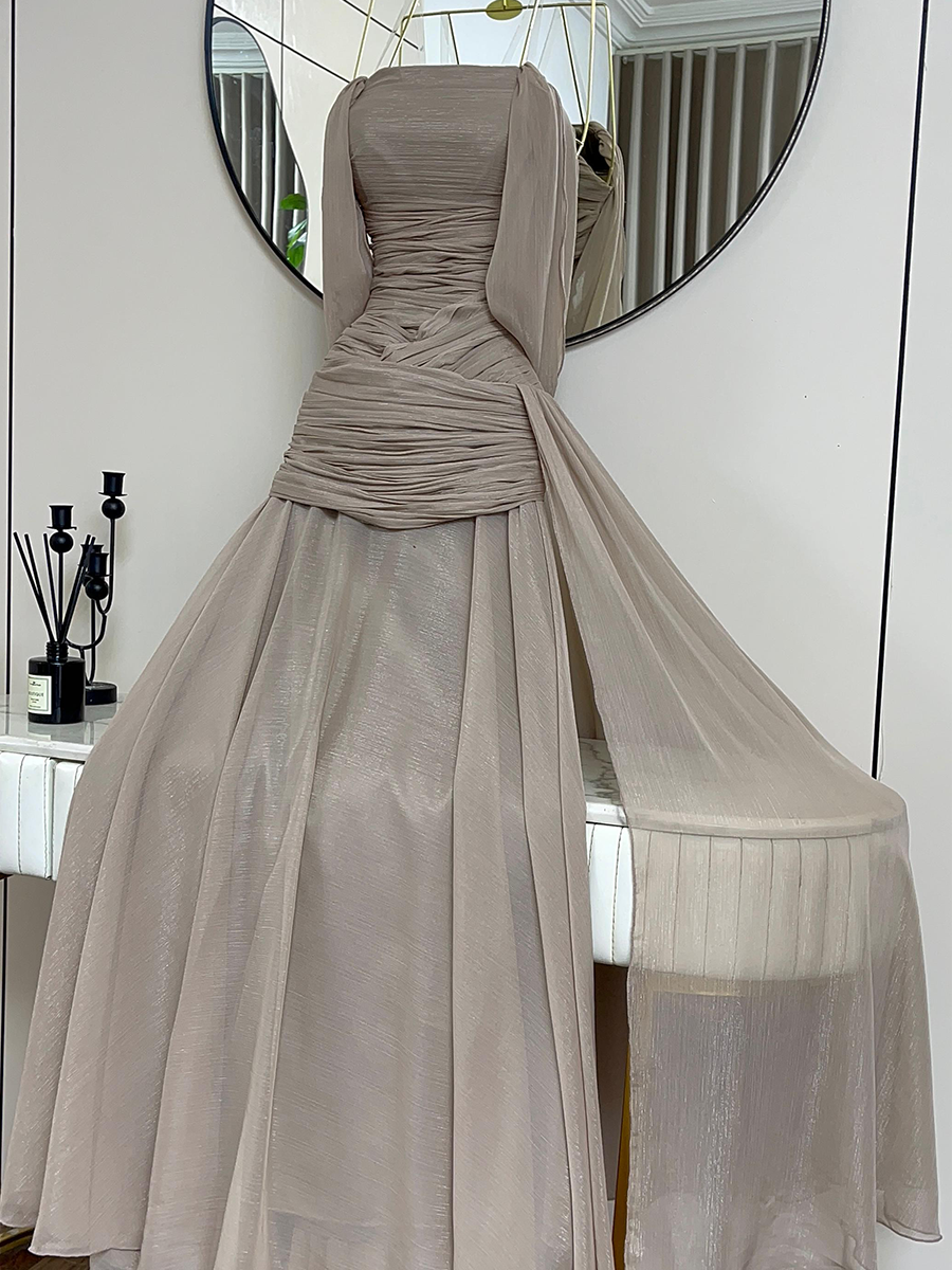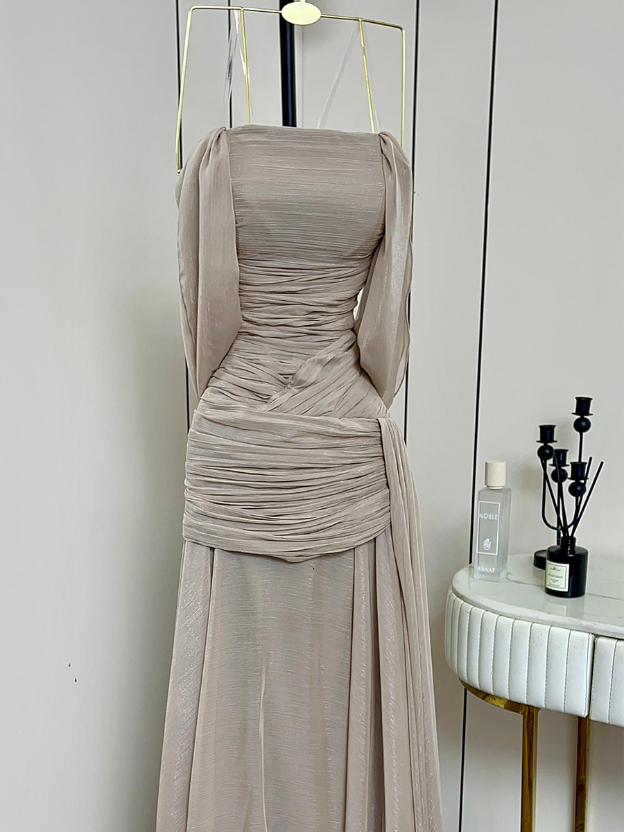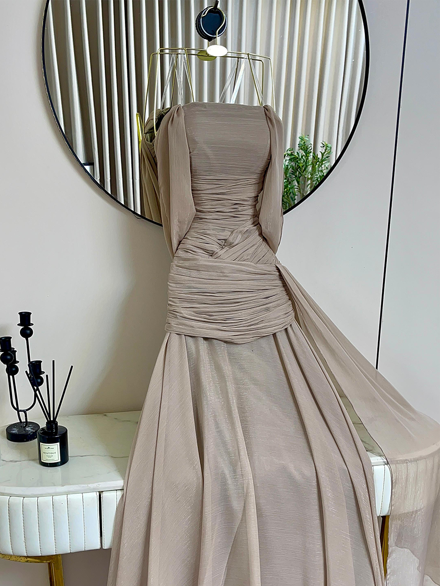 فستان سهرة بلون بيج هادئ يعكس الأناقة والبساطة الراقية، يتميز بتصميم درابيه ناعم يبرز الخصر بانسيابية أنثوية جذابة. القصة الواسعة من الأسفل تضيف حركة خفيفة ولمسة رومانسية، ما يجعله خيارًا مثاليًا للسهرات الراقية وحفلات الخطوبة البسيطة.