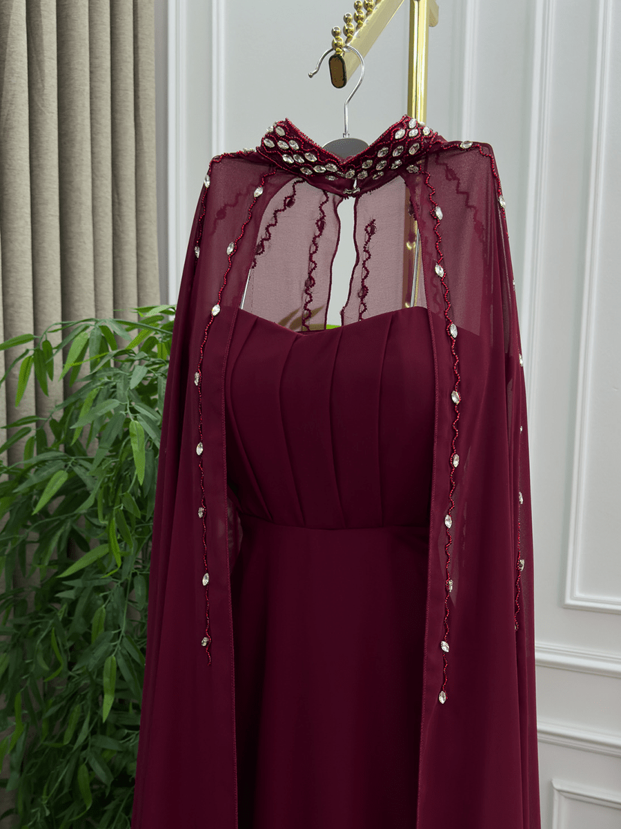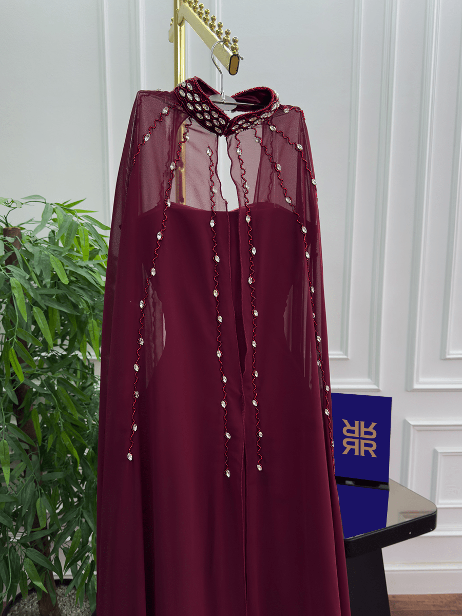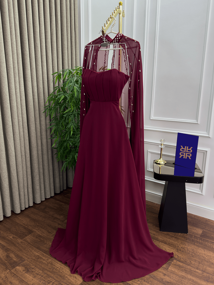 فستان سهرة بلون خمري ساحر يجمع بين البساطة والرقي. يتميز بقصة ناعمة من الأعلى وتنورة انسيابية تزيد من فخامة الإطلالة. مثالي للسهرات الراقية وحفلات الخطوبة.