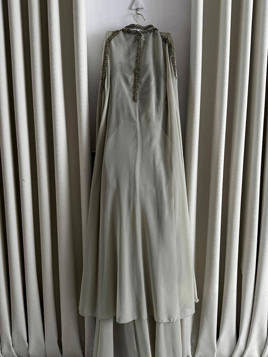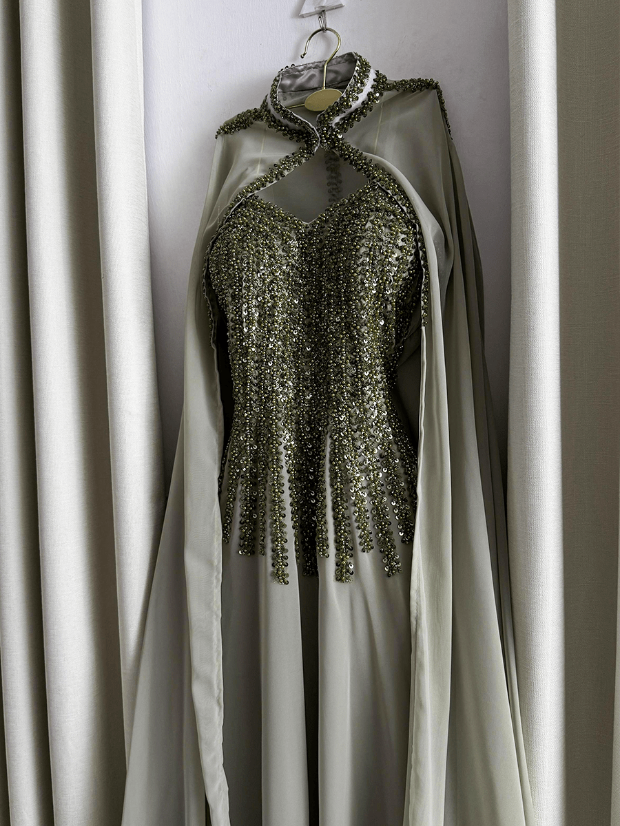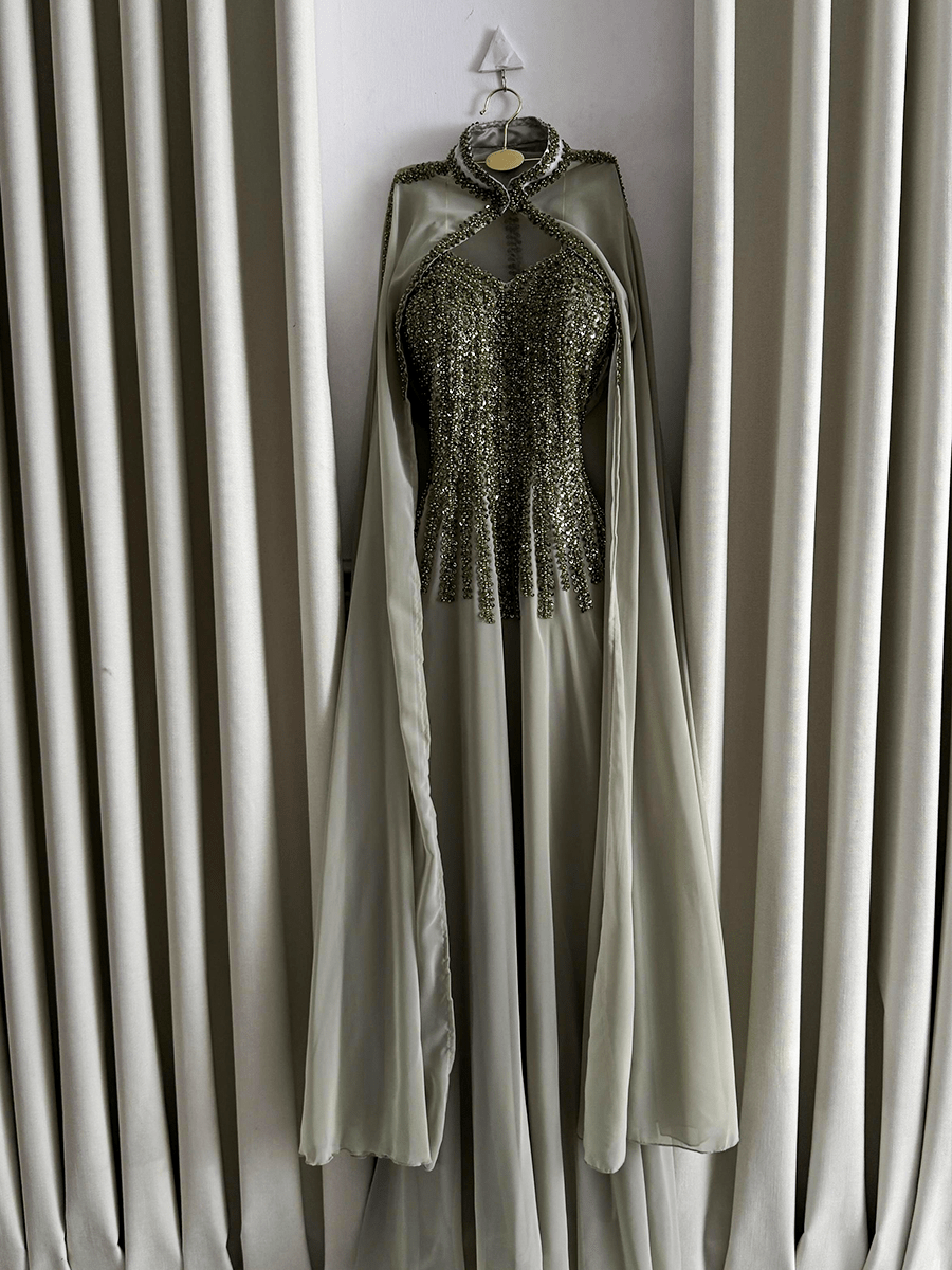 فستان سهرة فخم بلون زيتي راقٍ بتصميم أنثوي مميز وأكمام طويلة من الشيفون الناعم. التفاصيل المطرزة تضيف لمسة من الفخامة، والقصّة المتدرجة تمنح حضورًا جذابًا وأنيقًا في كل مناسبة مسائية راقية.