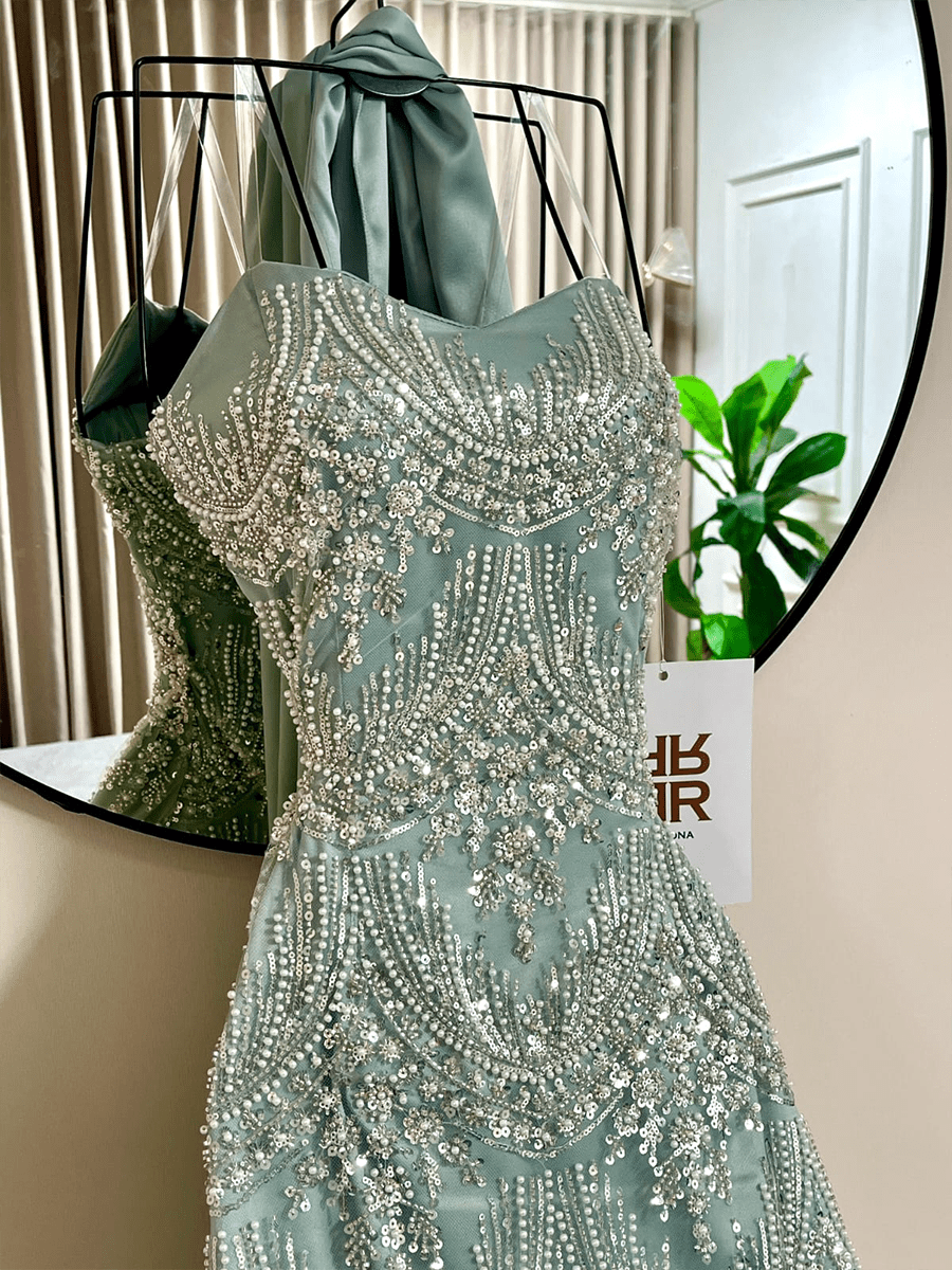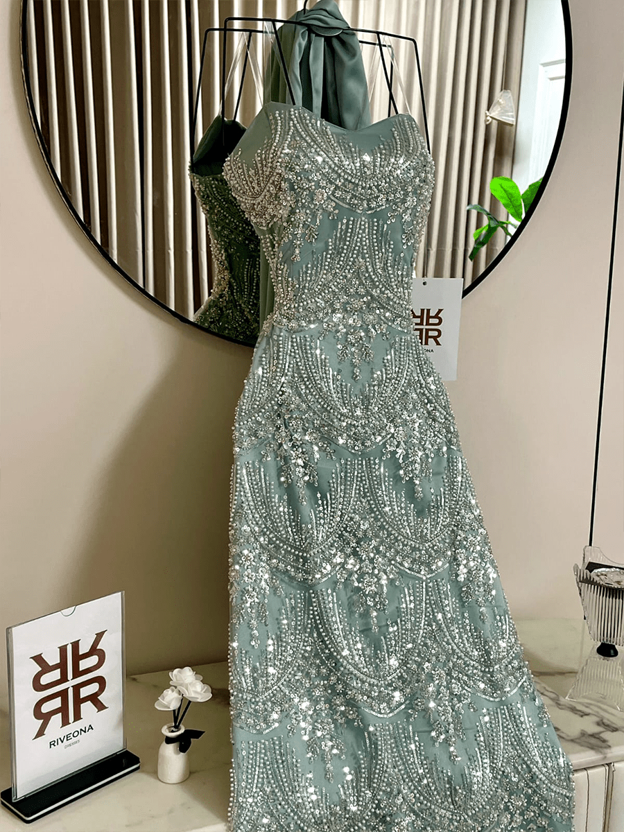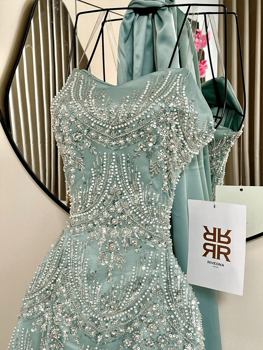 فستان طويل بلون سماوي ناعم، مزين بتطريزات كلاسيكية تعطيه مظهراً راقياً ومثاليًا للمناسبات الرسمية. يأتي بقصة مستقيمة تبرز القوام وتمنح إطلالة مفعمة بالنعومة والرقي.