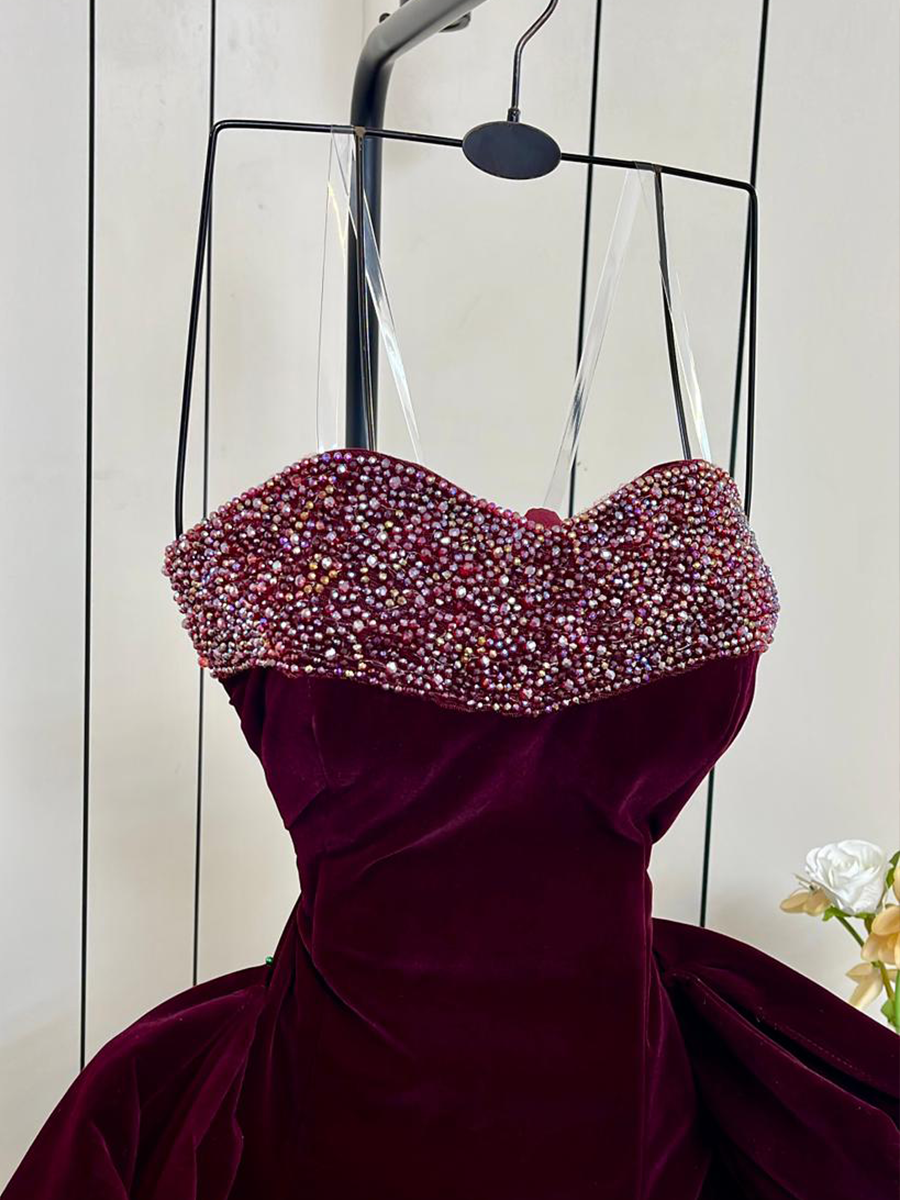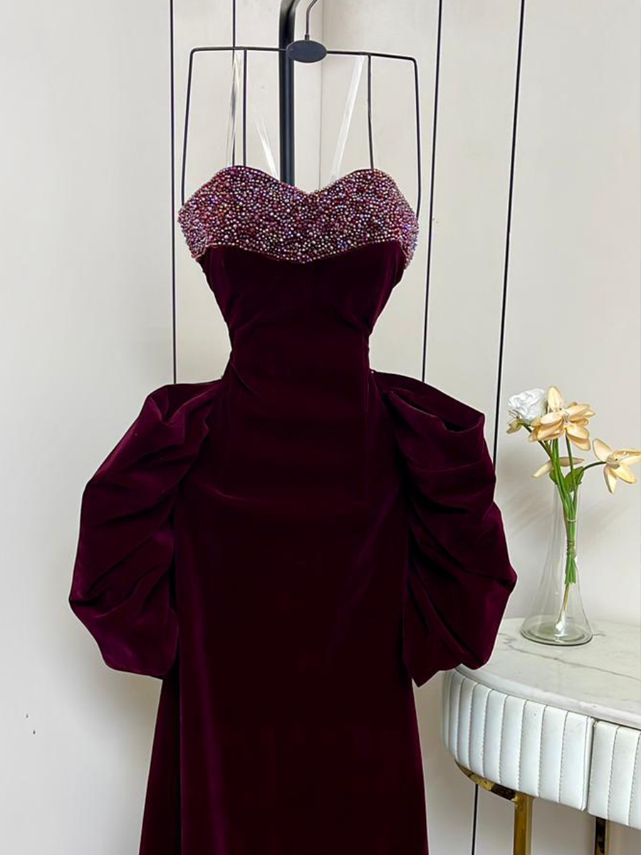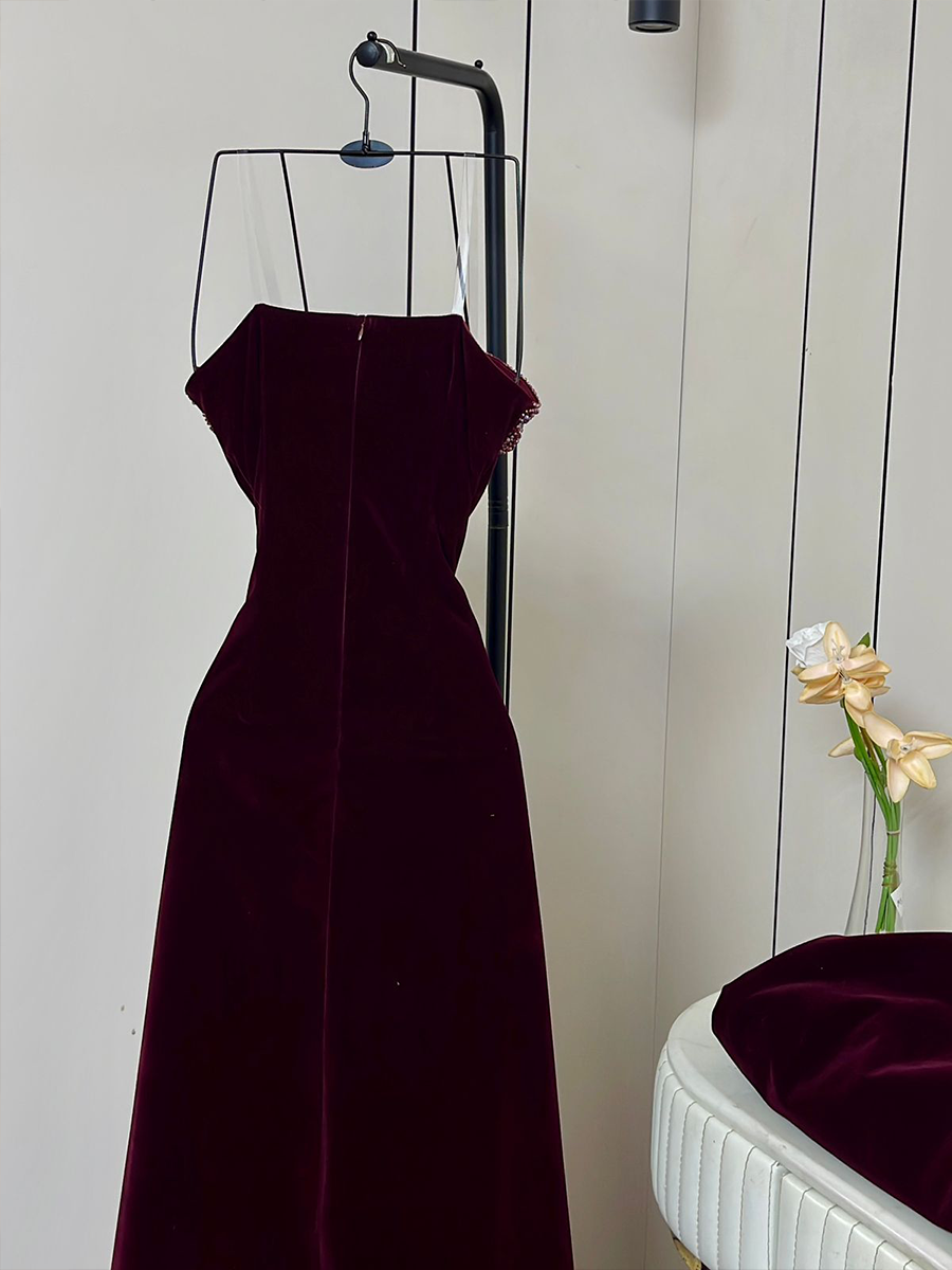 فستان سهرة مصنوع من المخمل الفاخر باللون العنابي، يتميز بتصميم كلاسيكي أنيق وقصة ناعمة تبرز جمال القوام. خيار مثالي للسيدات الباحثات عن الفخامة الهادئة في المناسبات الرسمية.