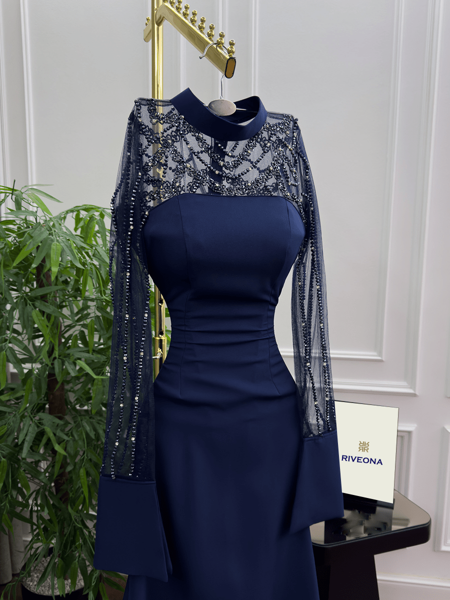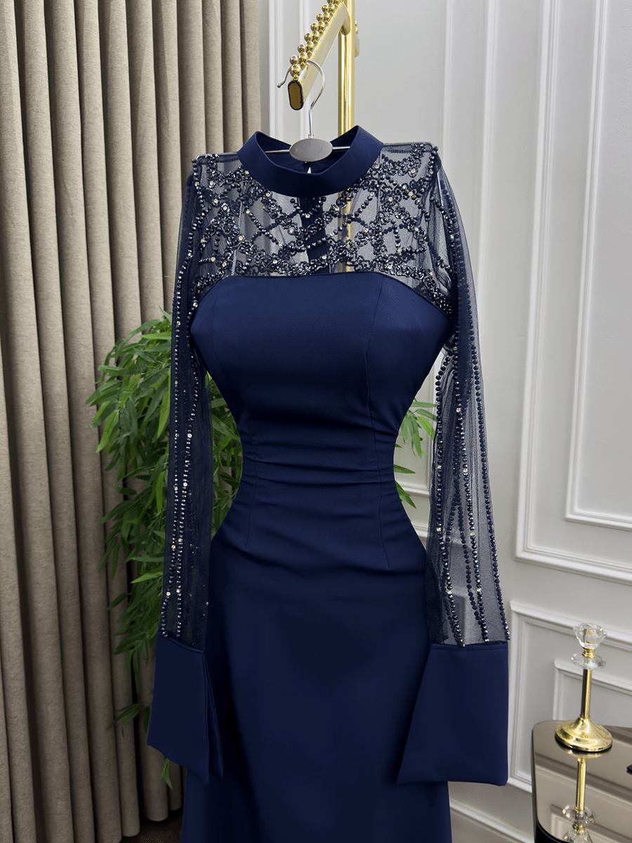 فستان سهرة أنيق باللون الكحلي الداكن بتصميم انسيابي يبرز القوام، مع أكمام من التول الشفاف المطرّز لإطلالة تجمع بين الكلاسيكية والرقي. مثالي للمناسبات الرسمية وحفلات المساء.