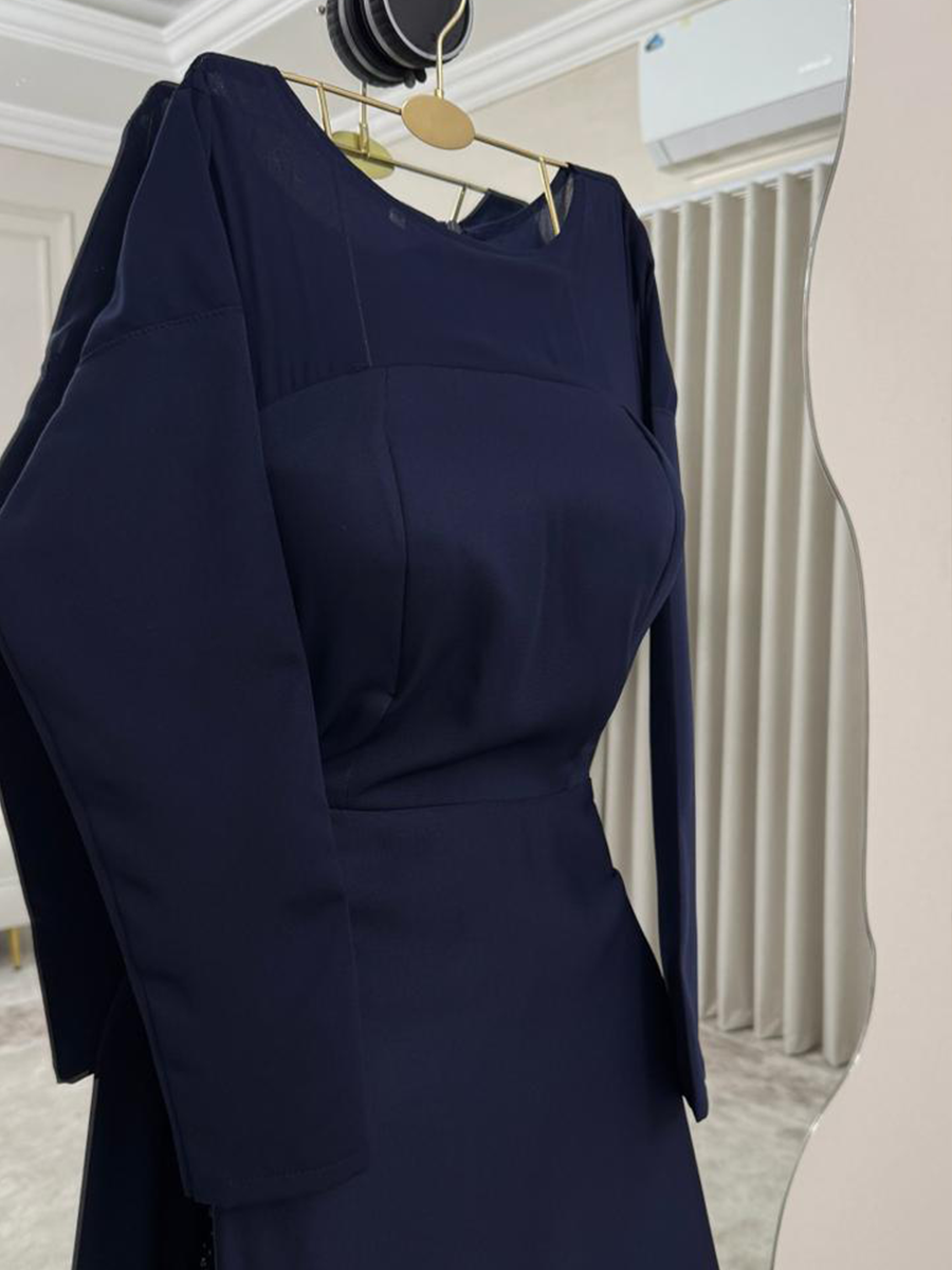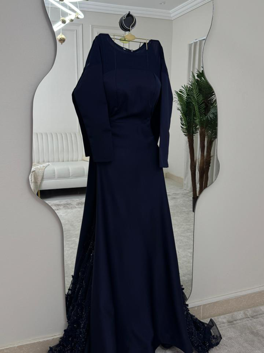 فستان سهرة باللون الكحلي بتصميم ناعم وبسيط يناسب محبات الإطلالات الهادئة الراقية. يتميز بقصة طويلة وانسيابية مع لمسة فاخرة عند الذيل، ليمنحك مظهرًا أنيقًا مثاليًا للسهرات الرسمية والمناسبات الخاصة.