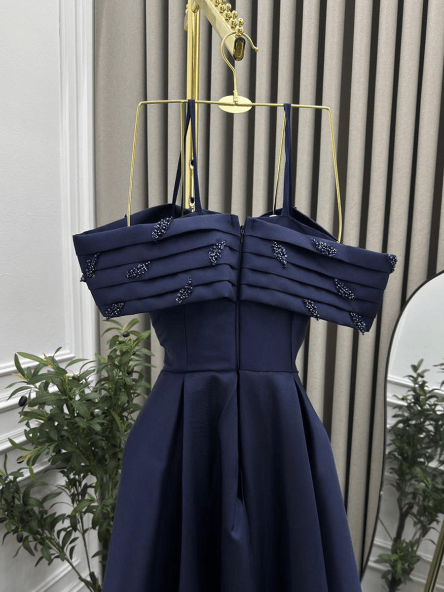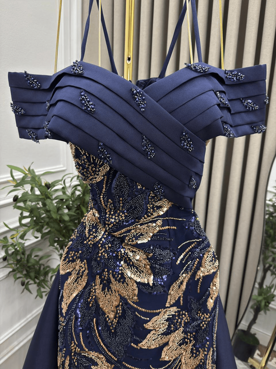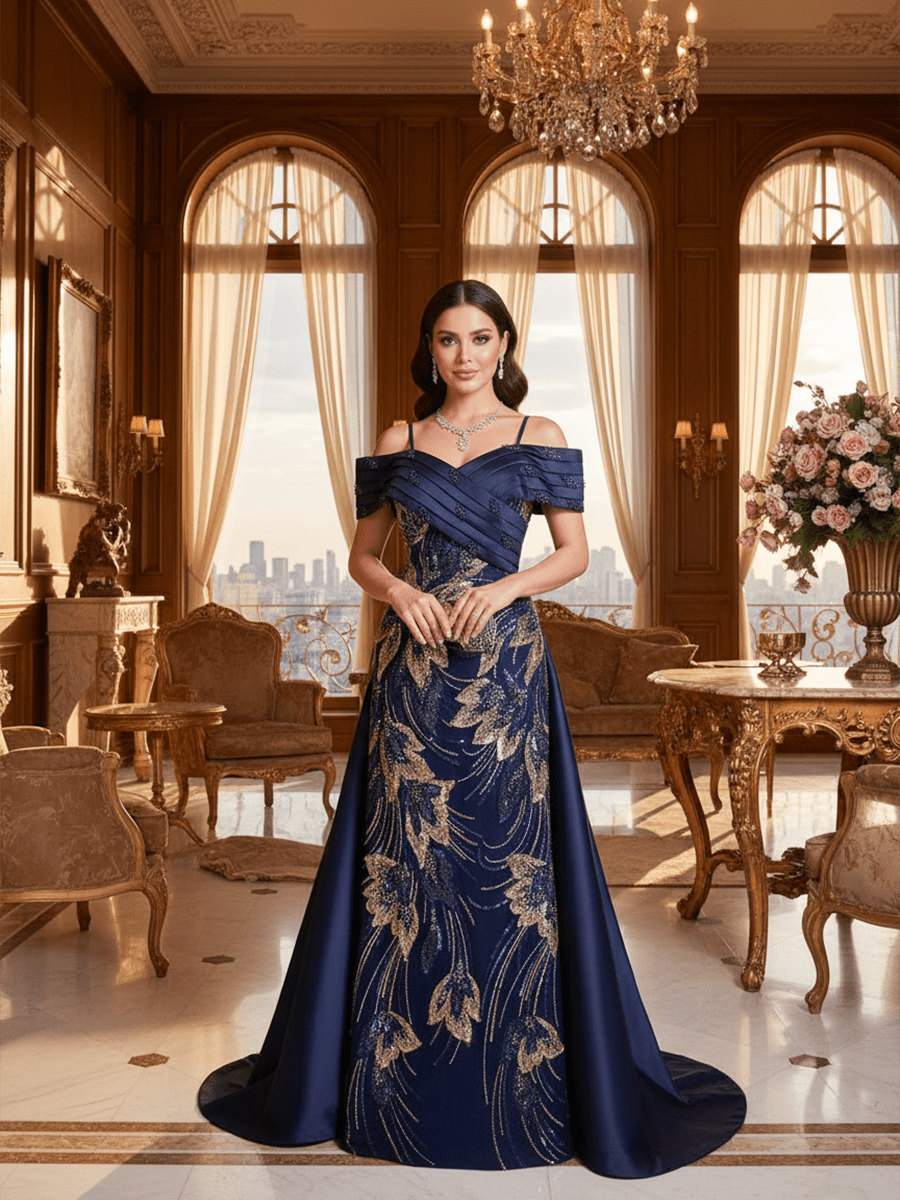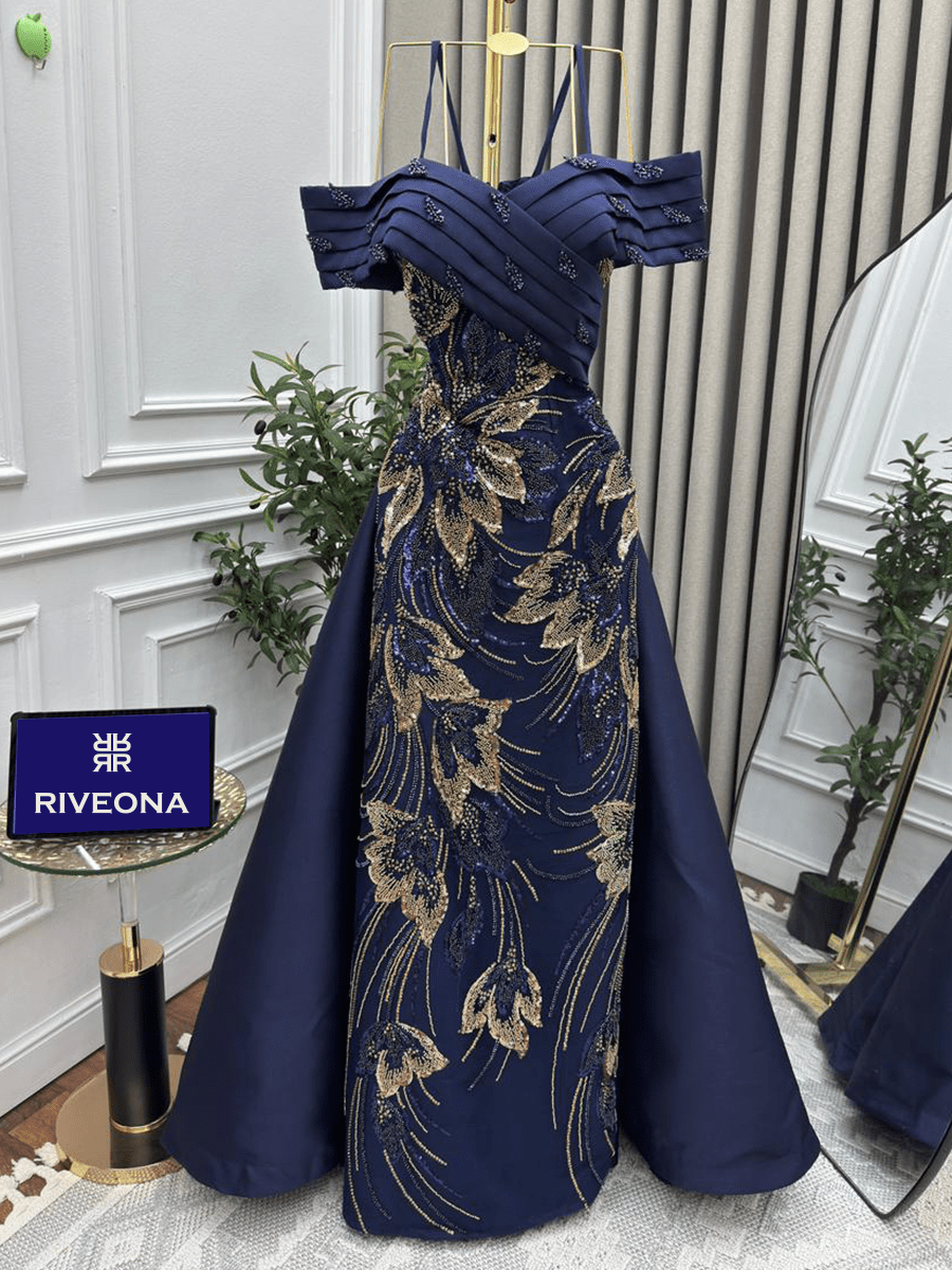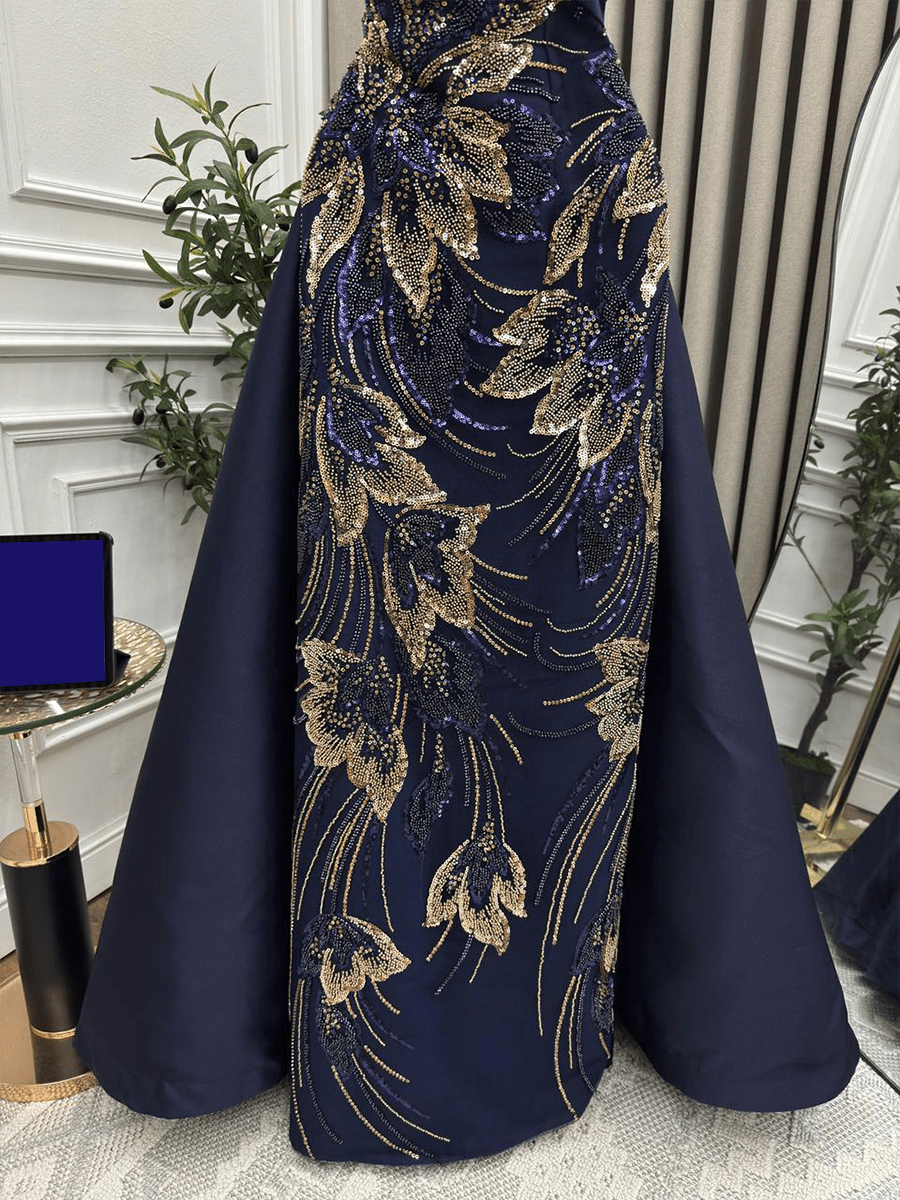 فستان راقٍ بلون كحلي عميق مع تطريزات ذهبية تبرز فخامته. تصميمه الأنيق من الأكتاف المفتوحة يمنح حضورًا لافتًا وأناقة ملكية. مناسب للمناسبات الرسمية والسهرات المميزة.