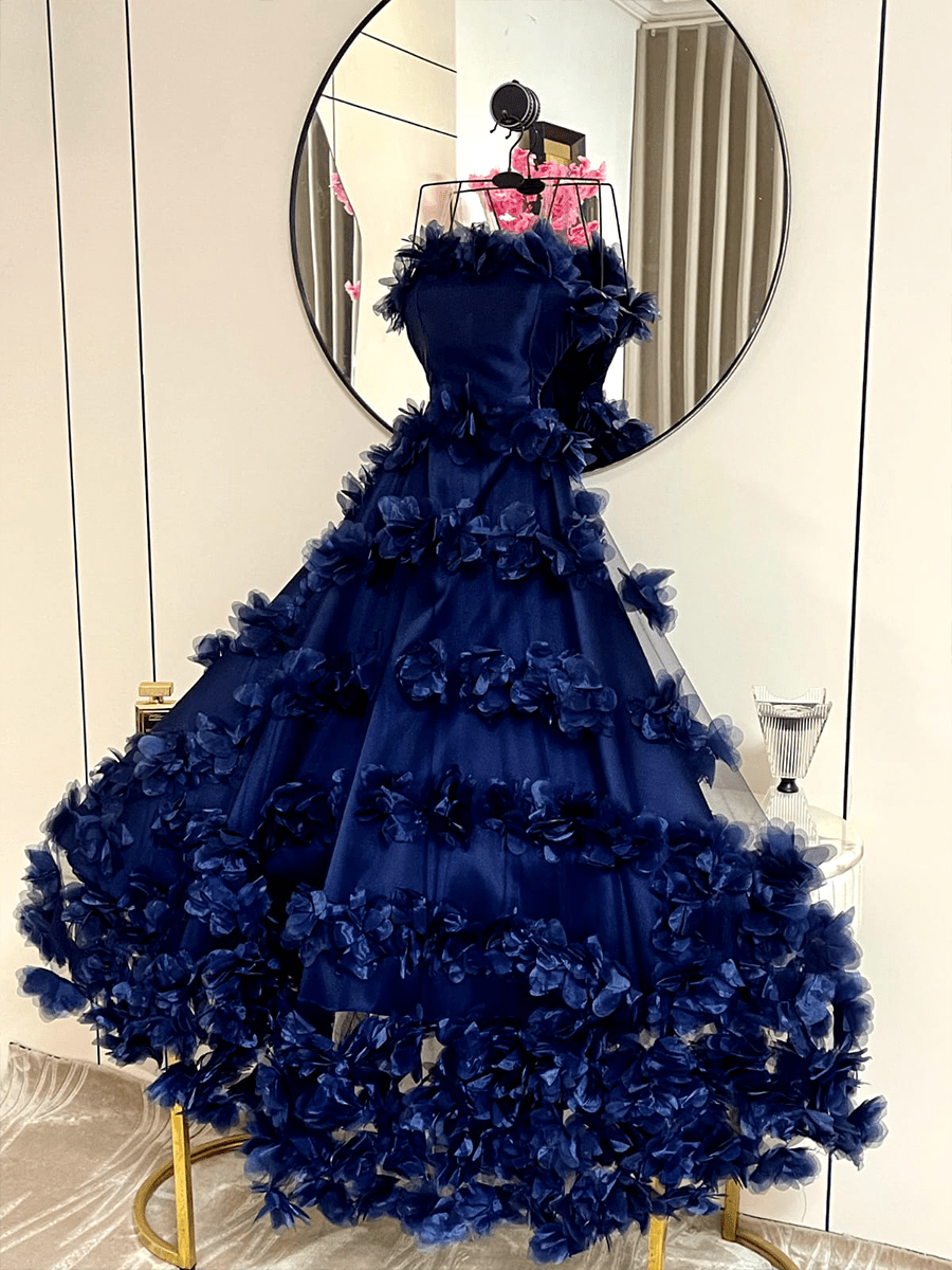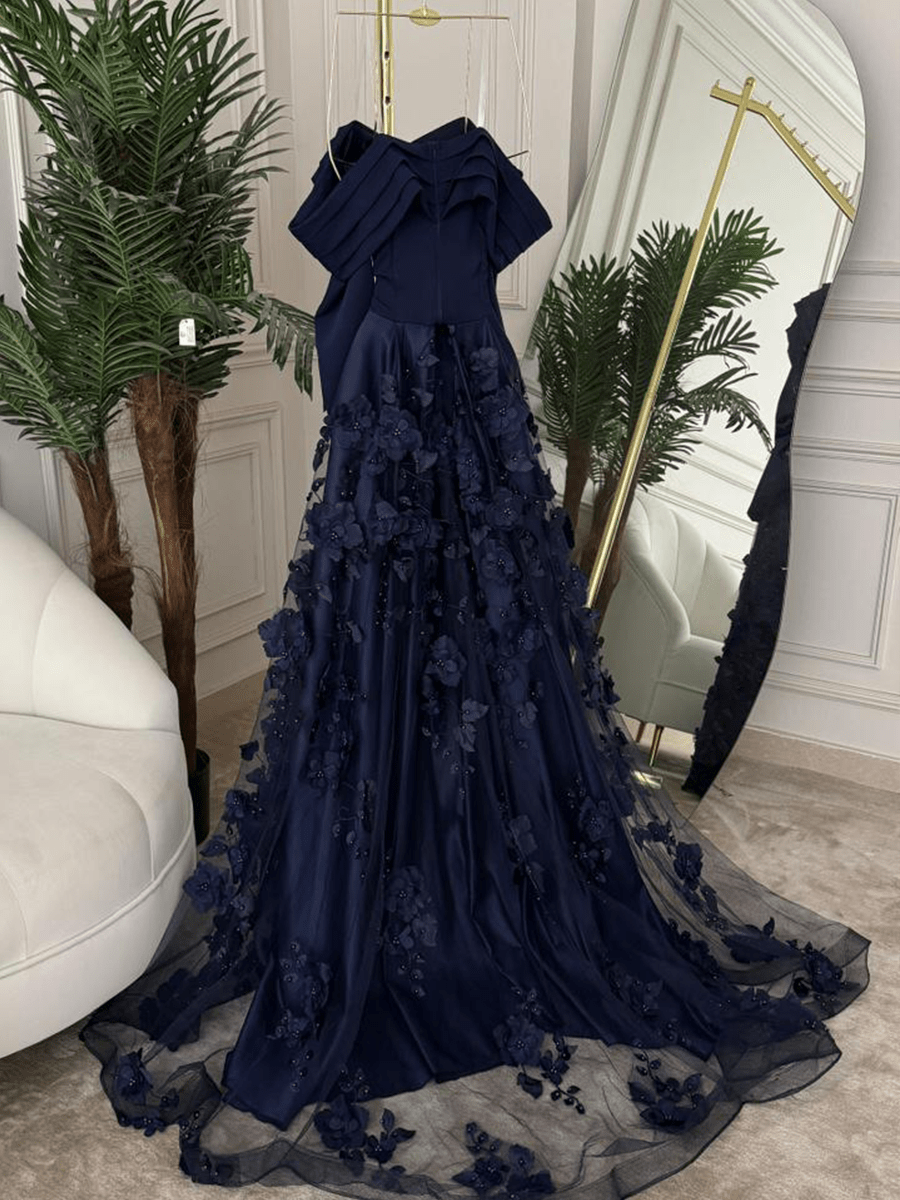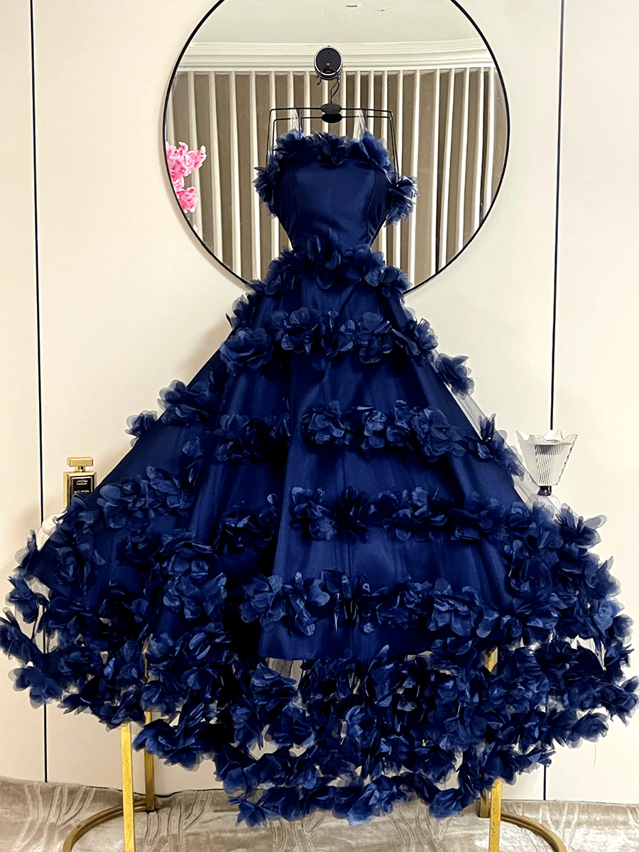 فستان سهرة فاخر باللون الكحلي الداكن، يتميز بتطريزات ثلاثية الأبعاد على شكل ورود تمنحه حجماً راقياً وحضوراً لافتاً. تصميمه المنفوش يضيف لمسة ملكية تناسب المناسبات الفاخرة وحفلات المساء.