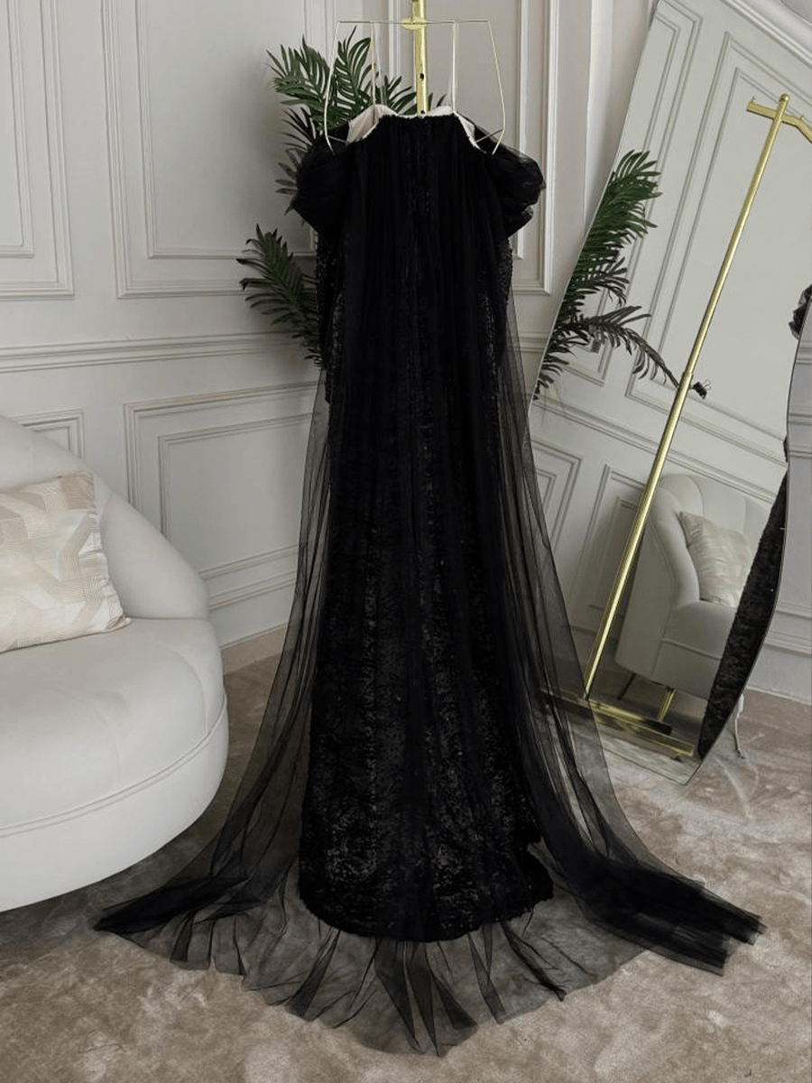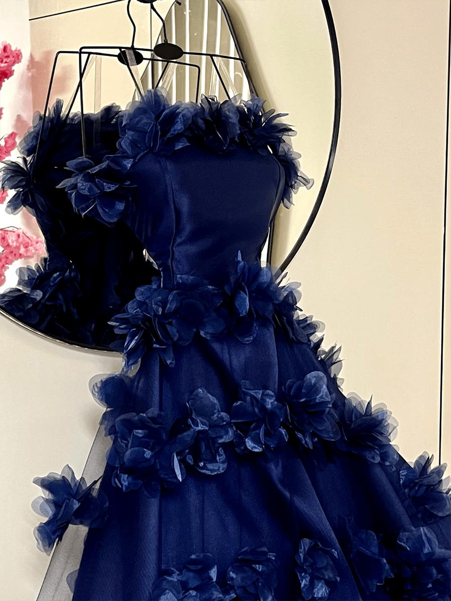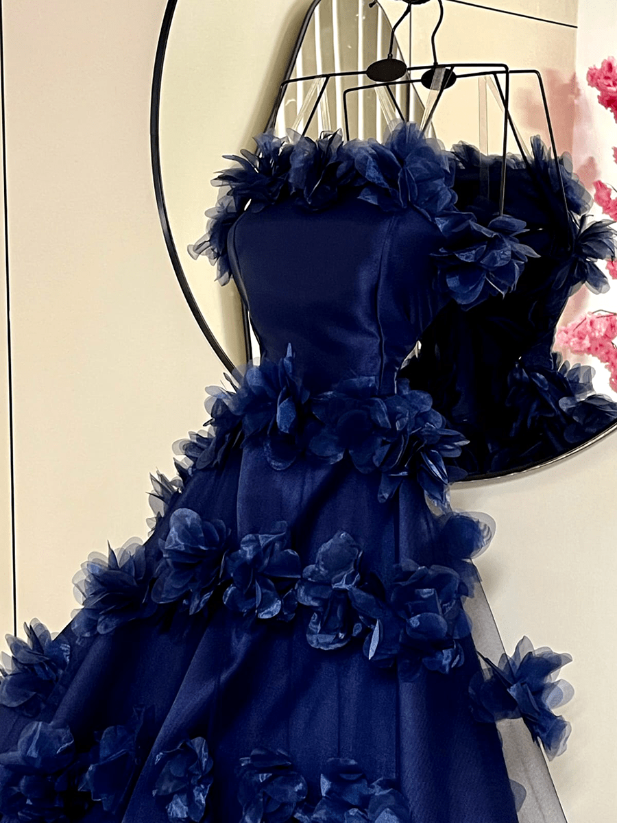 فستان سهرة فاخر باللون الكحلي الداكن، يتميز بتطريزات ثلاثية الأبعاد على شكل ورود تمنحه حجماً راقياً وحضوراً لافتاً. تصميمه المنفوش يضيف لمسة ملكية تناسب المناسبات الفاخرة وحفلات المساء.