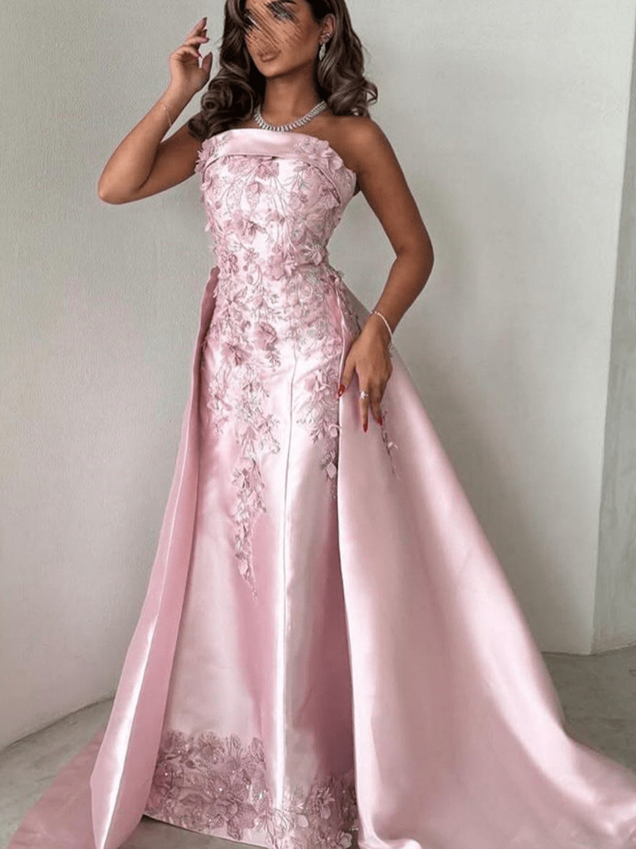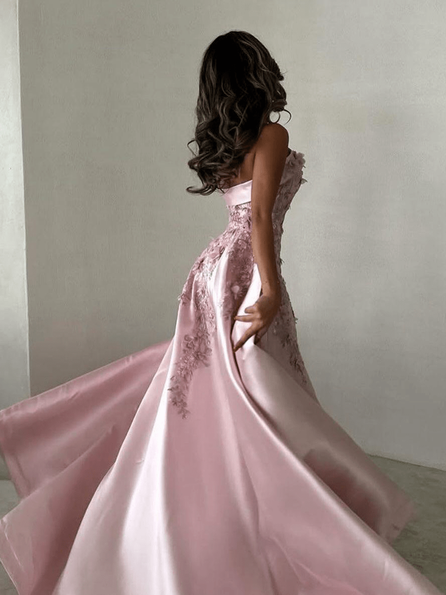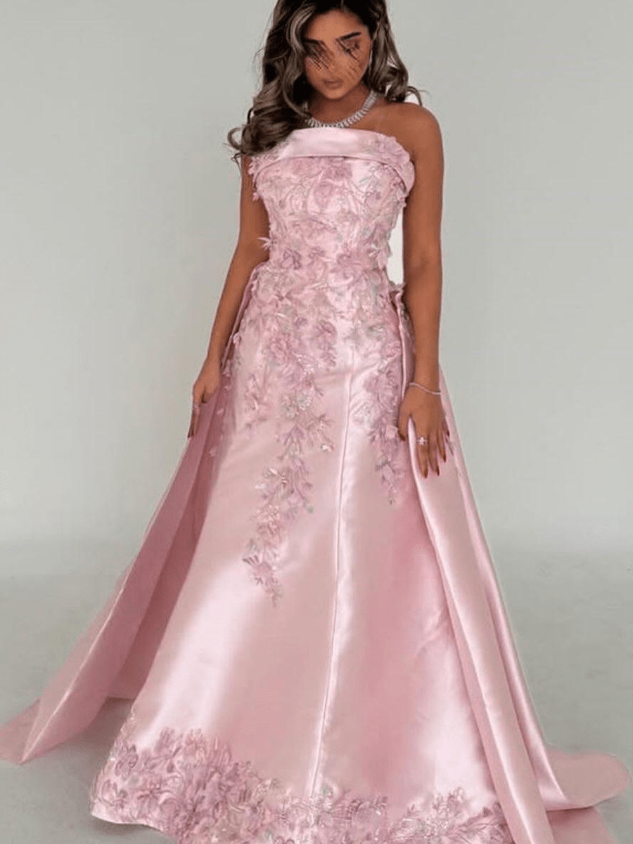 فستان من الساتان الفاخر والتطريز الدقيق باللون الوردي الفاتح، بقصة كورسيه تبرز الخصر وتنورة منسدلة تمنح إطلالة ملكية حالمة. مثالي للخطوبة أو المناسبات الفاخرة.