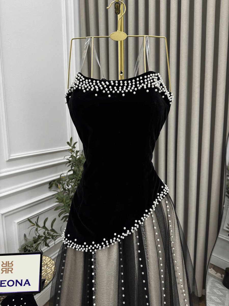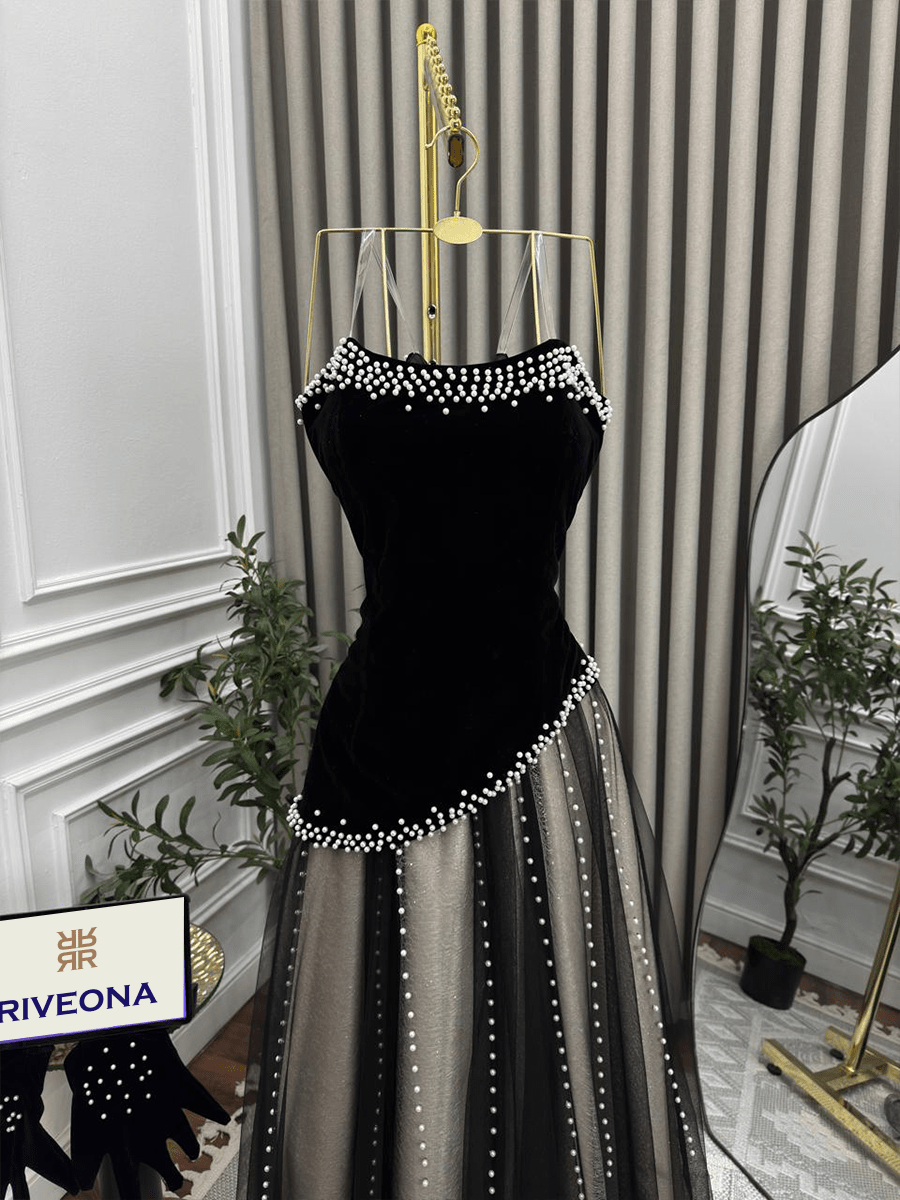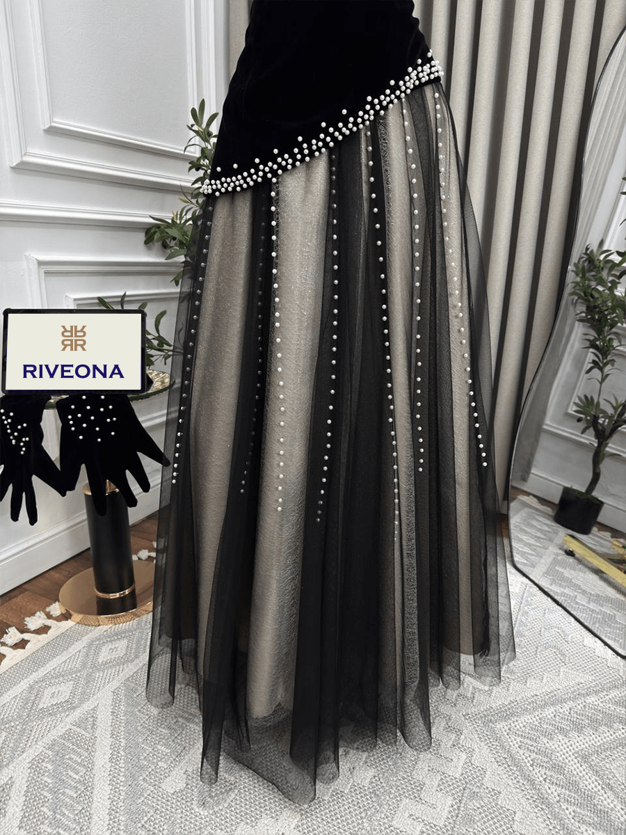 فستان سواريه مميز باللون الأسود بتصميم عصري يجمع بين المخمل الفاخر والتول المطرّز اللامع. قصّة الصدر المكشوفة وتنورة التول الطويلة تضفي فخامة وأنوثة لا مثيل لهما. مثالي لإطلالة جذابة في المناسبات الراقية.