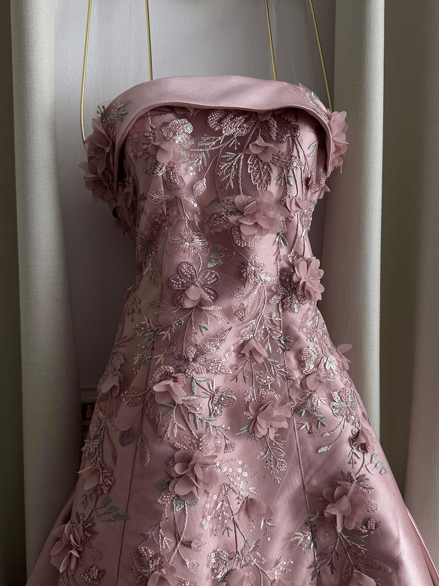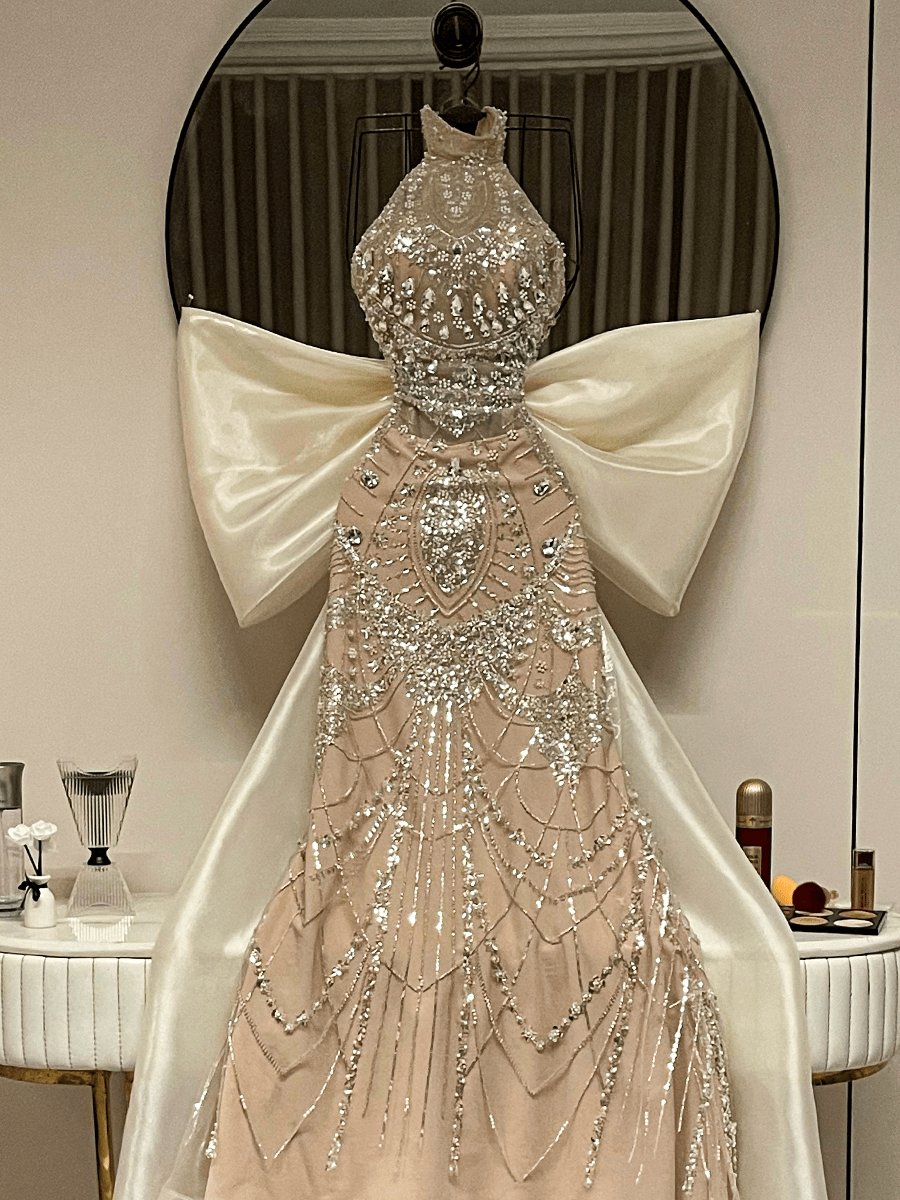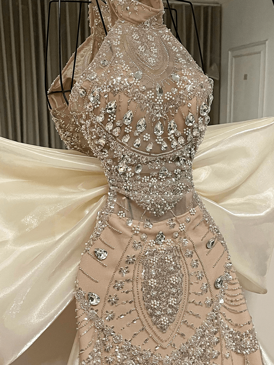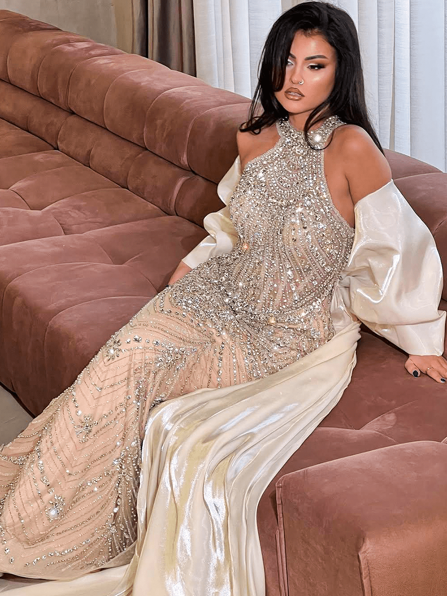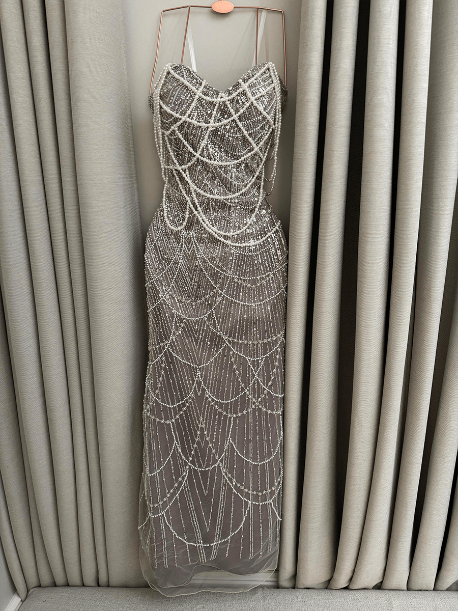 فستان فخم باللون الشامبين مطرز بالكامل بأحجار ولؤلؤ لامع يمنحك بريقًا راقيًا في كل خطوة. يتميز بأكمام من الساتان اللامع وقصة أنثوية جذابة، مثالي للسهرات والمناسبات الفاخرة.