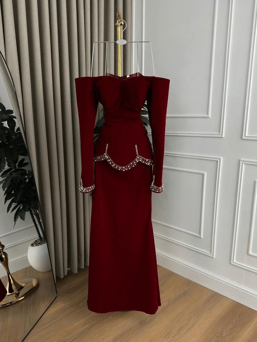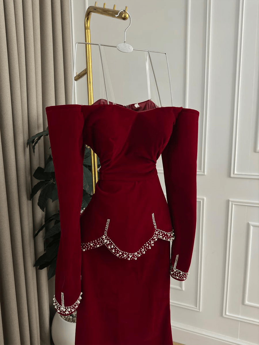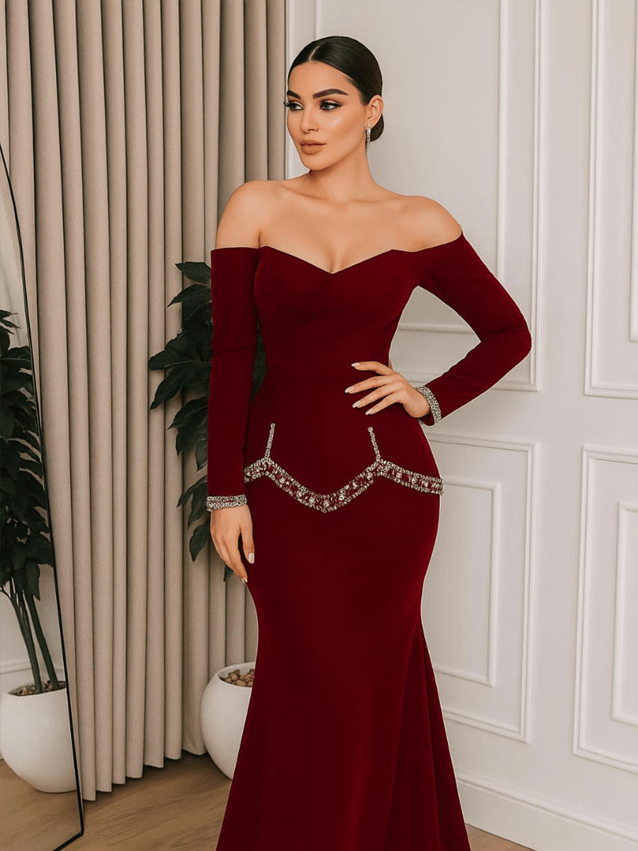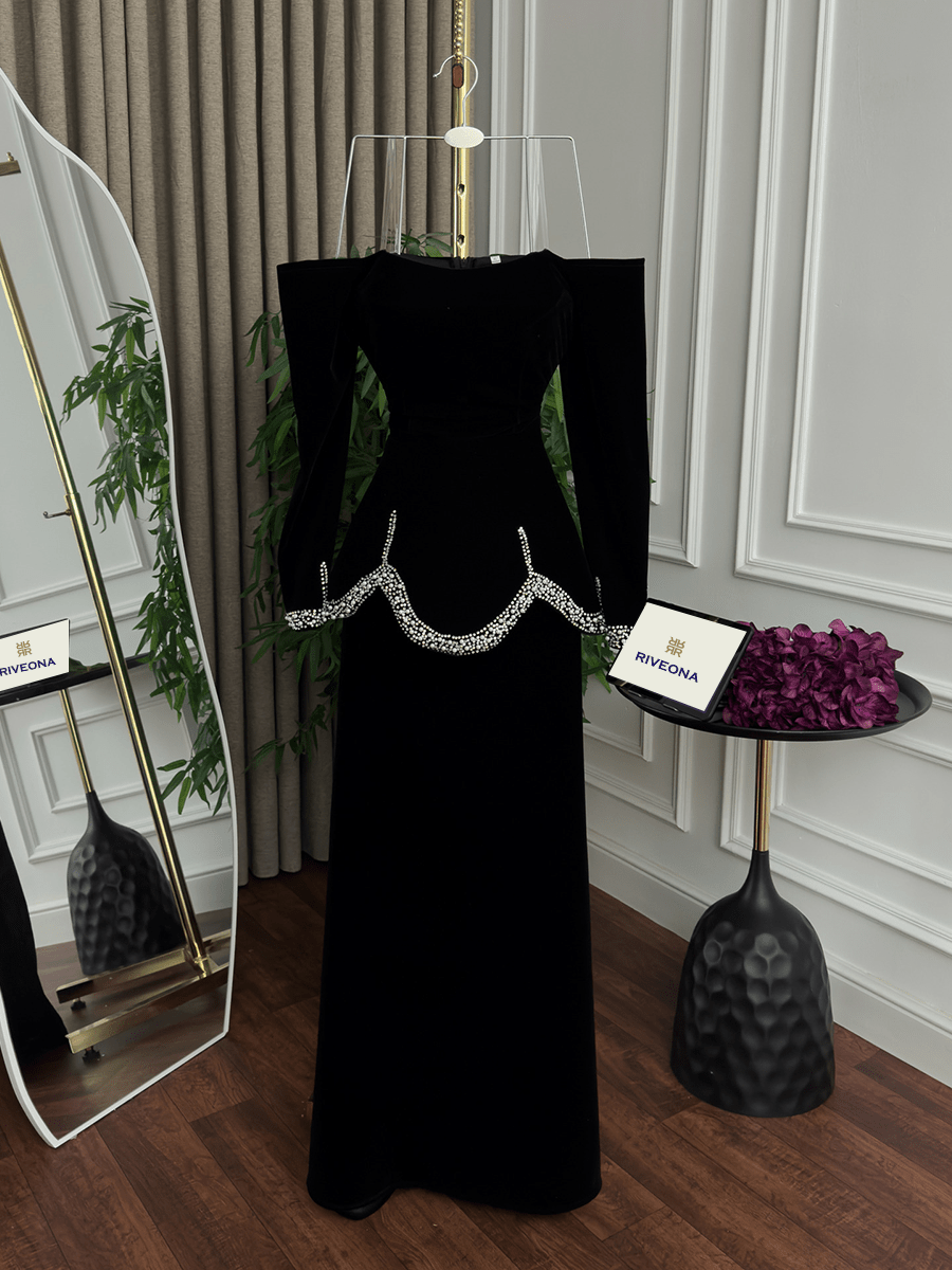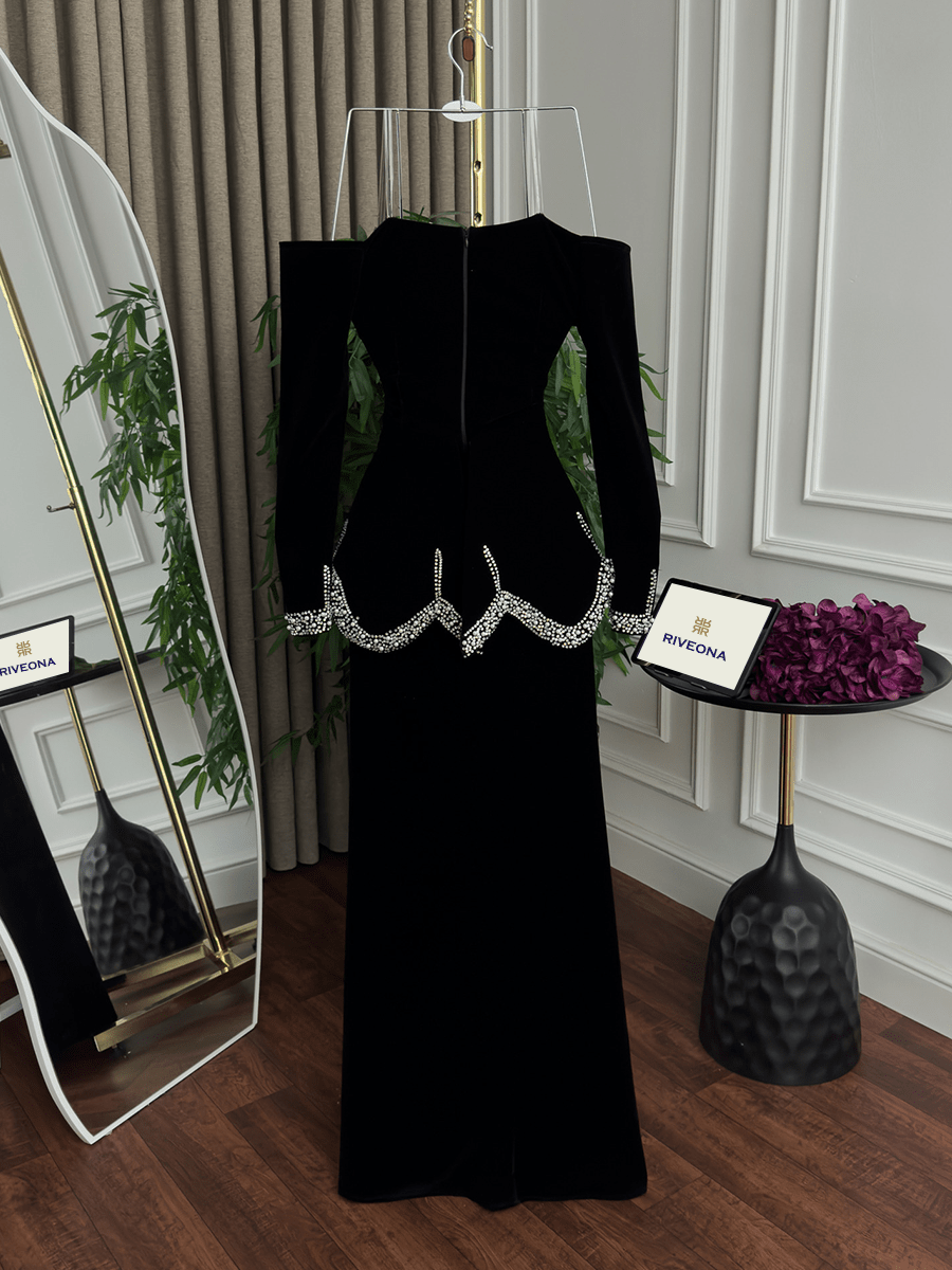 فستان سواريه فاخر من قماش المخمل الأسود، بتصميم أوف شولدر يبرز جمال القوام ويُكمل بتفصيل سلسلة فضية على الخصر تضيف لمسة من الترف. مثالي للسهرات الراقية والمناسبات الخاصة.