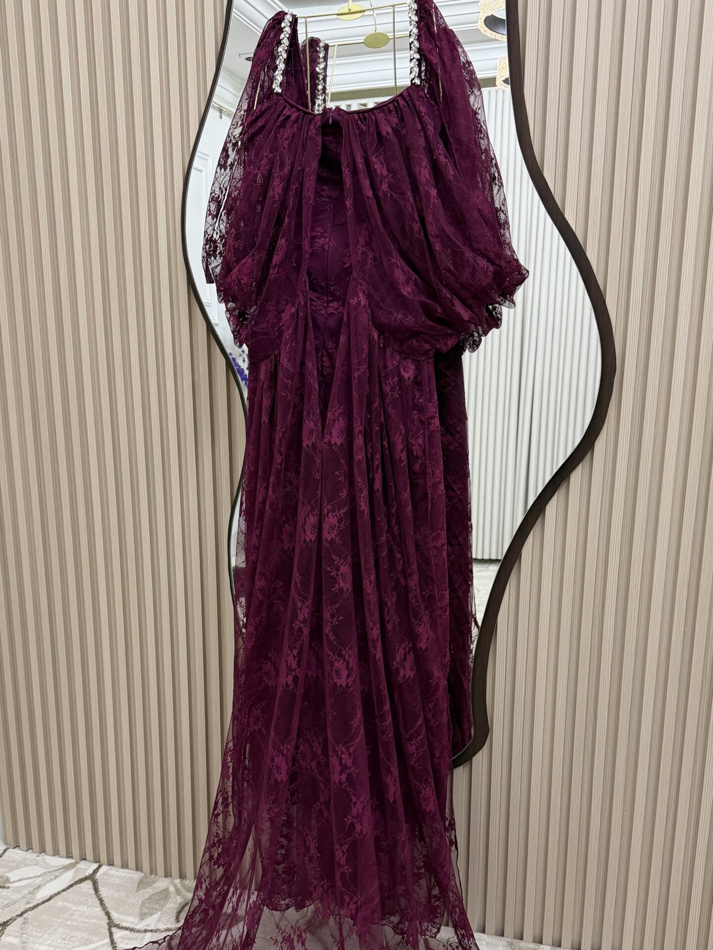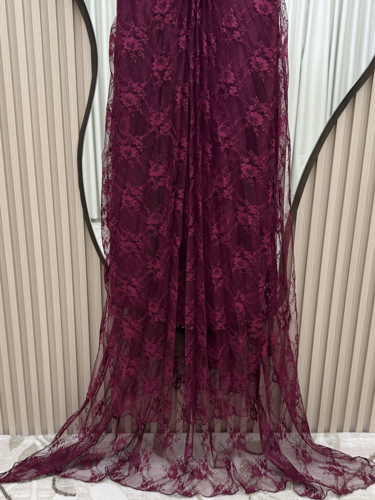 يتميز بتصميم طويل وانسيابي مصنوع من قماش الدانتيل الفاخر بطبقات ناعمة تعطيه مظهراً راقياً وجذاباً.