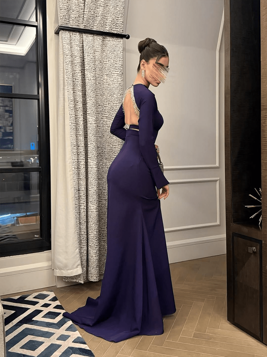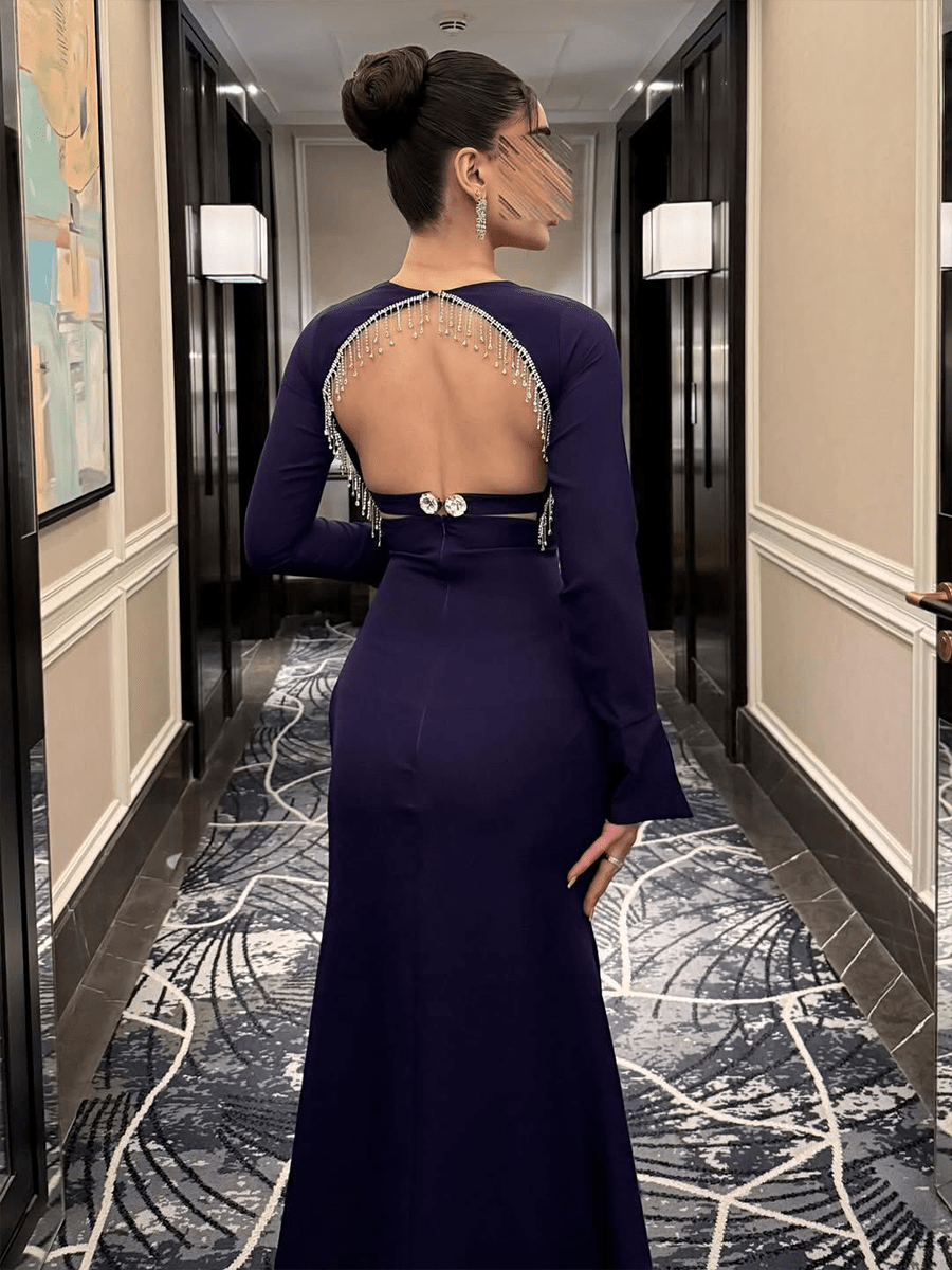 فستان سهرة كحلي بتصميم راق وجريء في منطقة الصدر والأكمام الطويلة، يمنح مظهراً متناسقاً يجمع بين الرقي والثقة. خيار مثالي للسهرات الراقية والمناسبات المسائية.