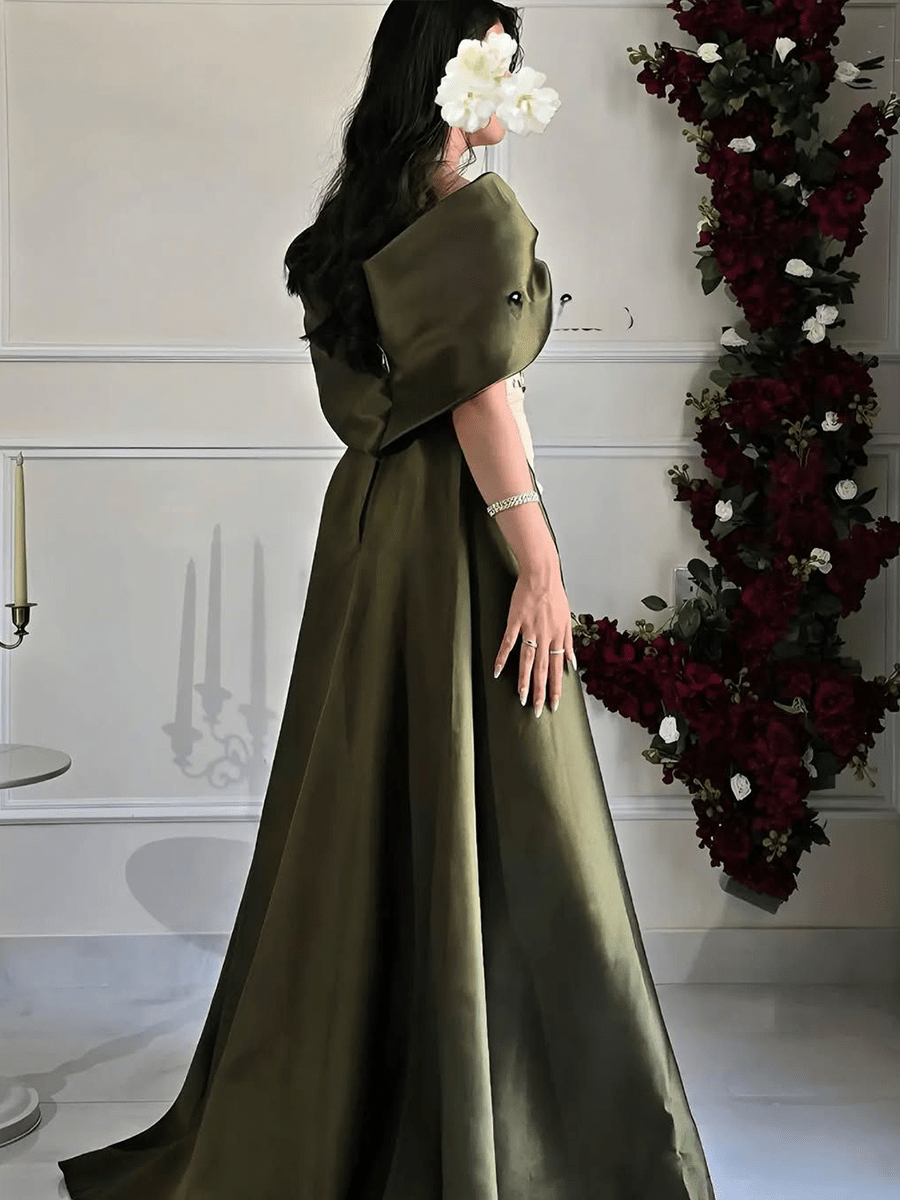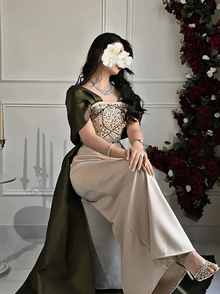 فستان سهرة أنيق يجمع بين الفخامة والرقي، مصنوع من خامة الميكادو اللامعة التي تمنح إطلالة ملوكية، بتصميم راقٍ منسدل بقصّة ضيّقة مع كاب طويل باللون الزيتوني الداكن.