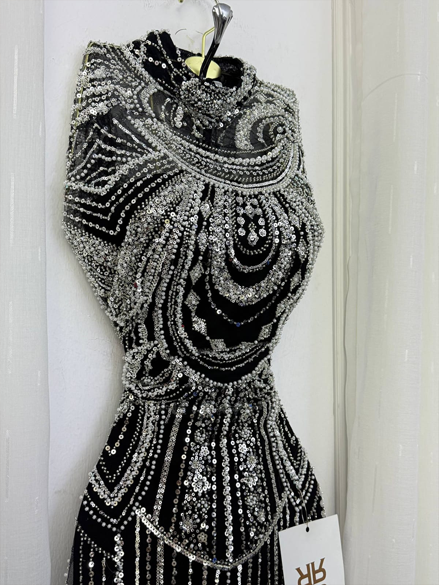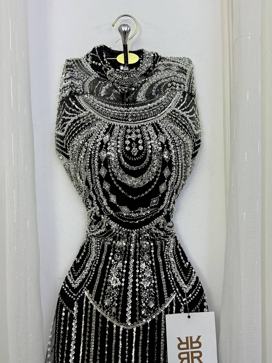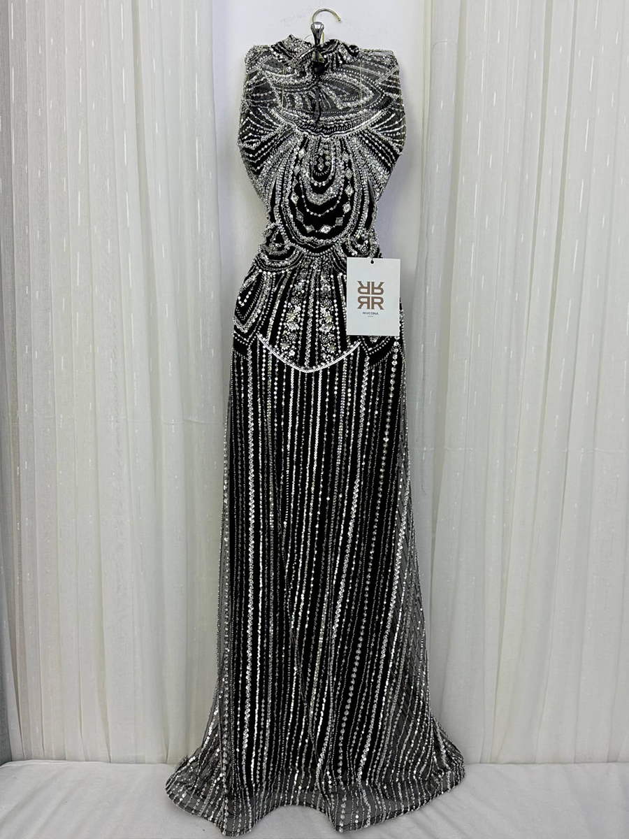 فستان سهرة بتصميم هالتر جذاب، يجمع بين اللونين الأسود والفضي بتطريزات هندسية فاخرة تمنح الاناقة طابعاً عصرياً. قصته الراقية تضفي انسيابية على القوام وتناسب إطلالات المساء الراقية.