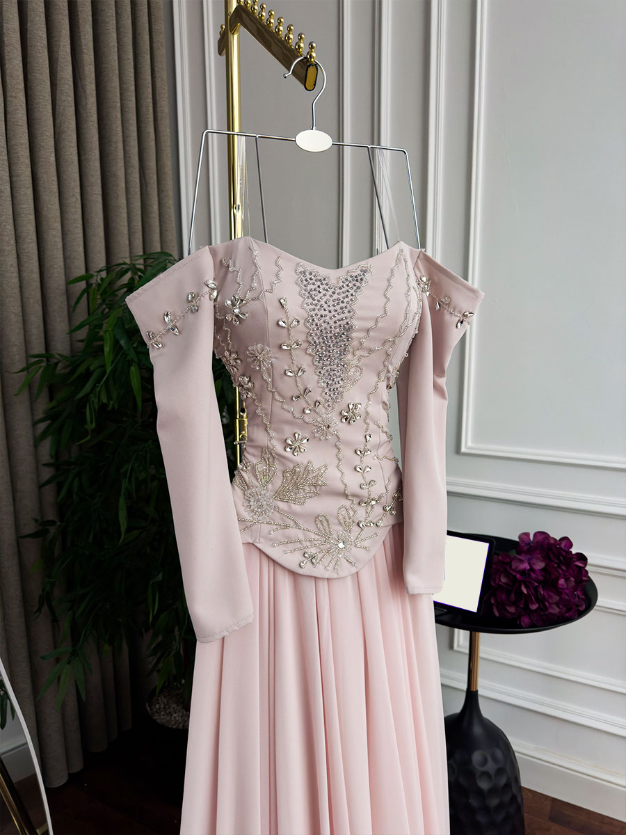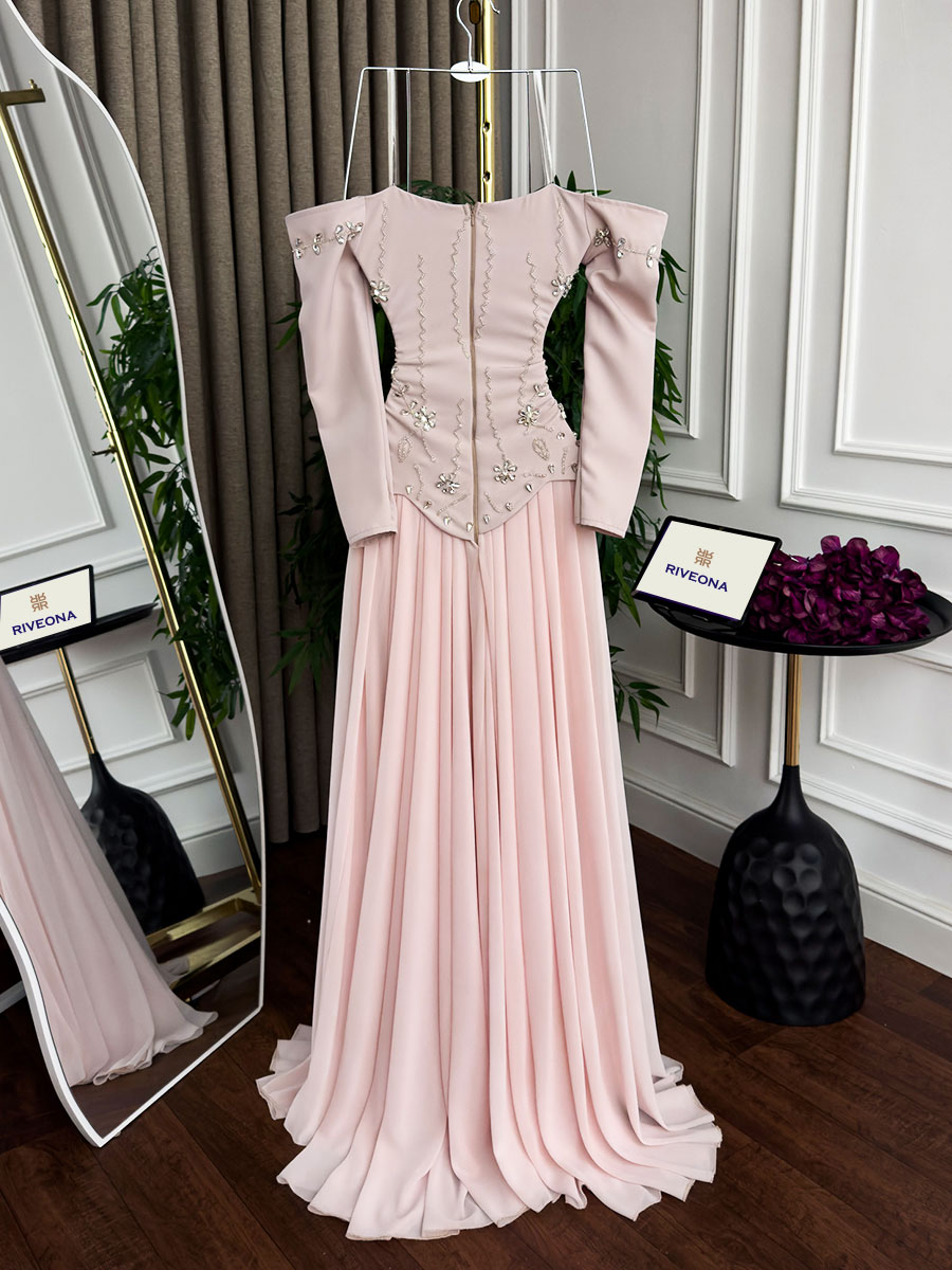 فستان سهرة أنيق باللون الوردي الفاتح، يتميز بتطريز يدوي متقن على منطقة الصدر مع أكمام طويلة منسدلة تمنحه لمسة ملكية. قصة الخصر الضيقة مع تنورة منسدلة تمنح إطلالة راقية تناسب الخطوبات والمناسبات الرسمية.