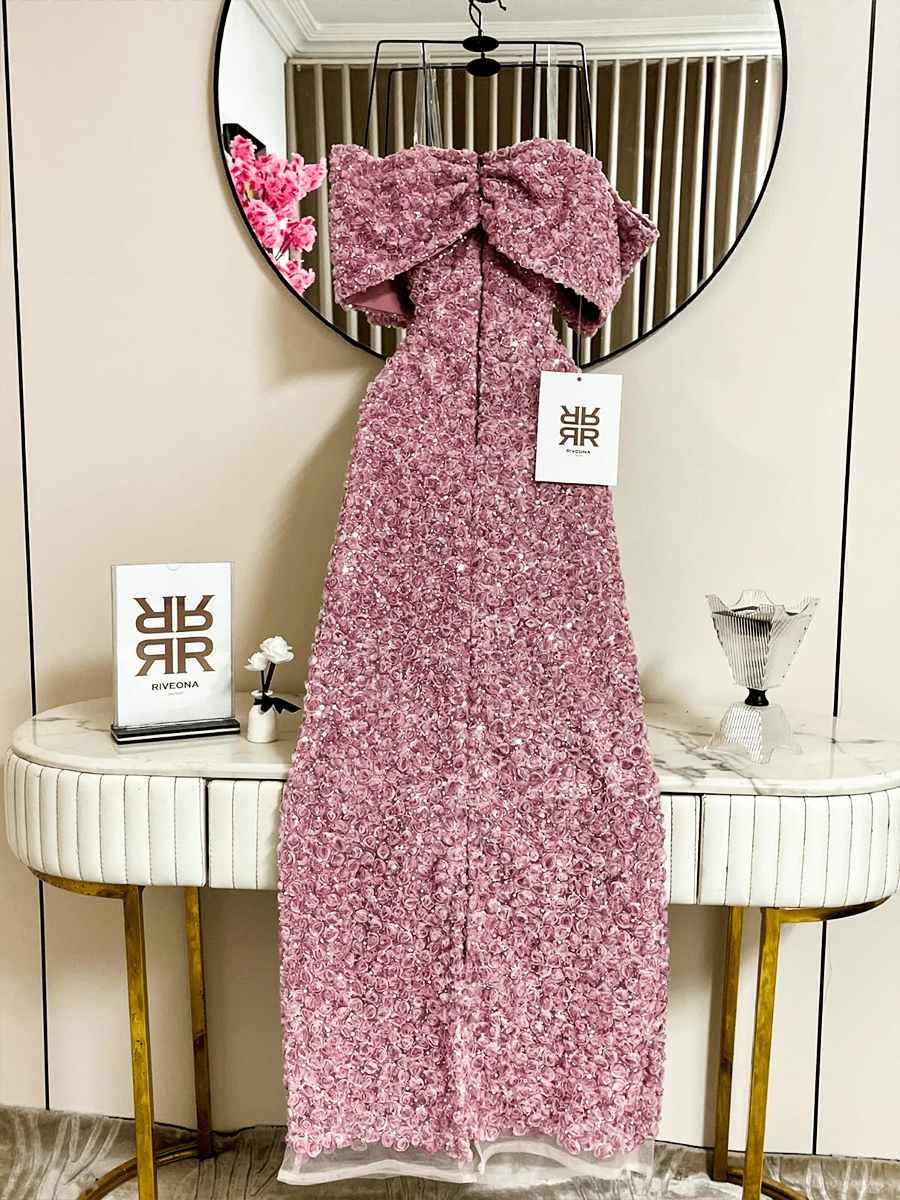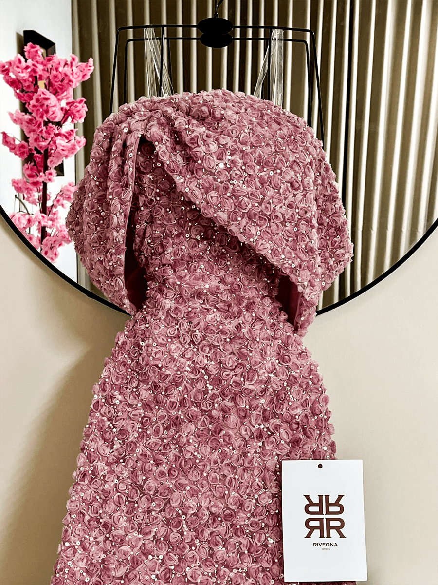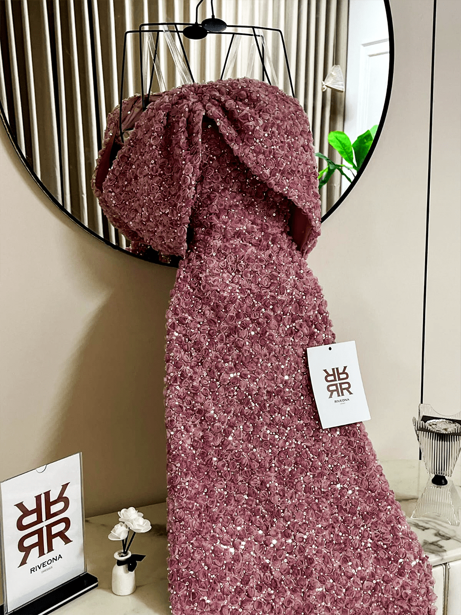 فستان وردي بتصميم راقٍ ومطرز بالكامل بتفاصيل دقيقة تضفي عليه لمعة جذابة. يأتي مع شال ناعم يكمّل الإطلالة ويمنحها لمسة فخامة تناسب أي مناسبة مسائية.