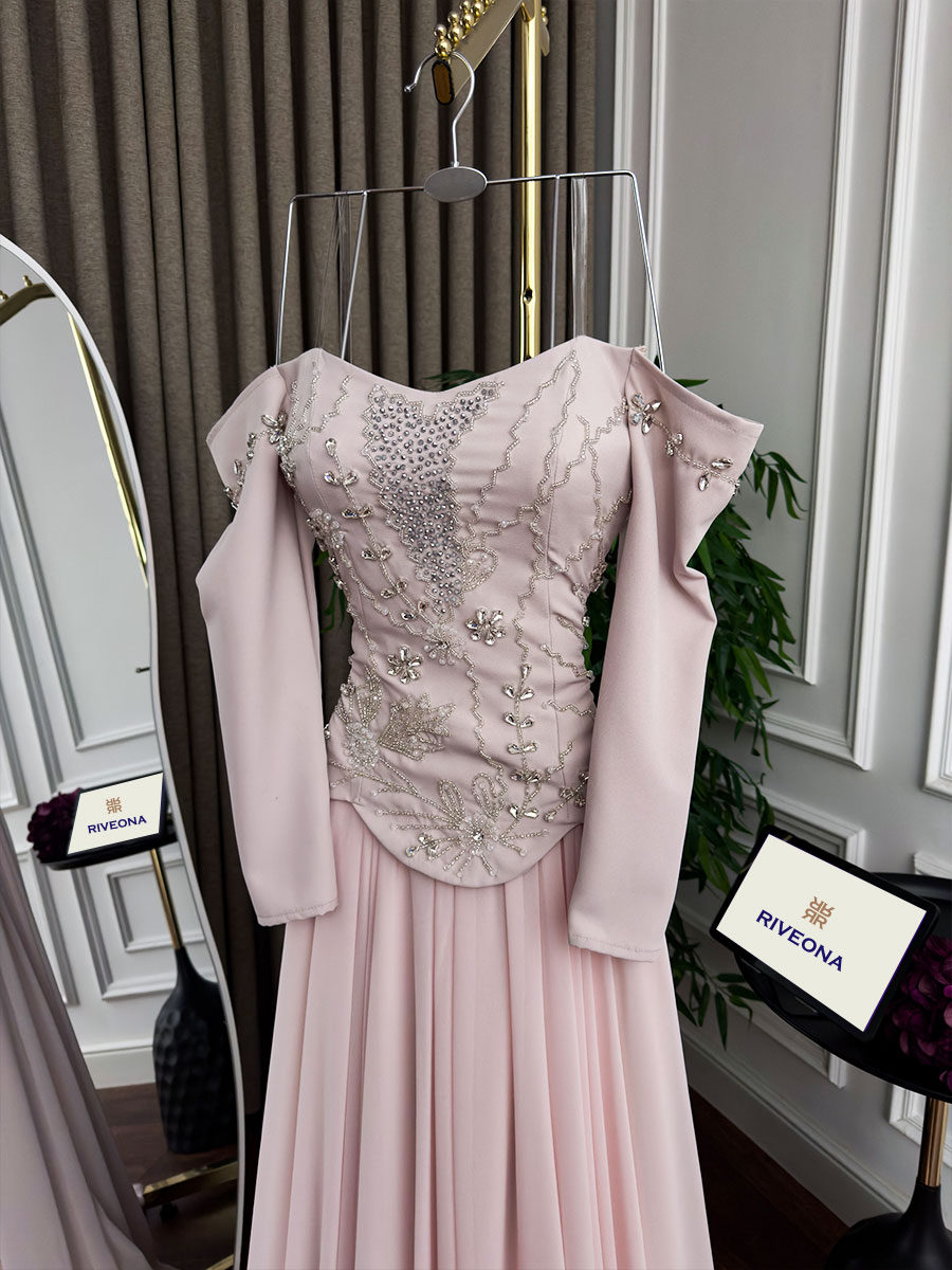 فستان وردي باربي  مطرّز بأكمام فاخرة تطريز يدوي وكلوش دبل شيفون